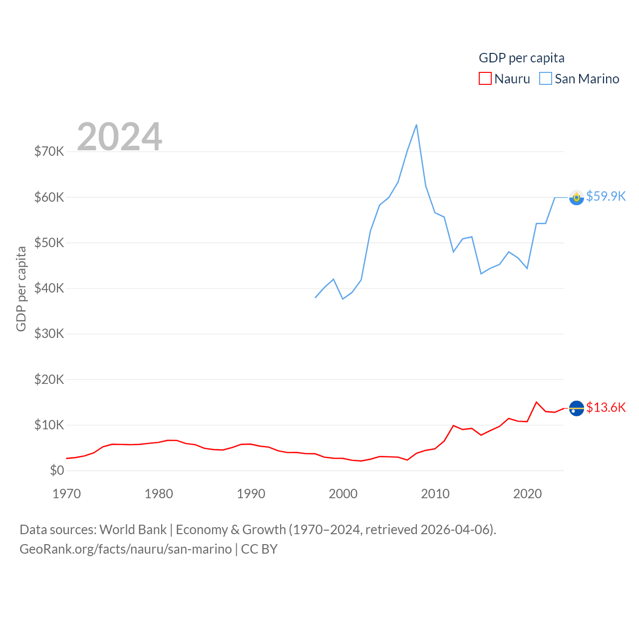 By GDP, Nauru ranks 195/197 ($163M) and San Marino ranks 180/197 ($2.03B). By GDP per capita, Nauru ranks 74/197 ($13,609), while San Marino ranks 15/197 ($59,880).