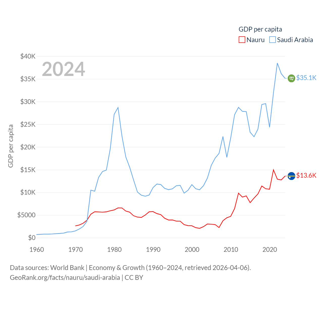 By GDP, Nauru ranks 195/197 ($163M) and Saudi Arabia ranks 18/197 ($1.24T). By GDP per capita, Nauru ranks 74/197 ($13,609), while Saudi Arabia ranks 33/197 ($35,122).