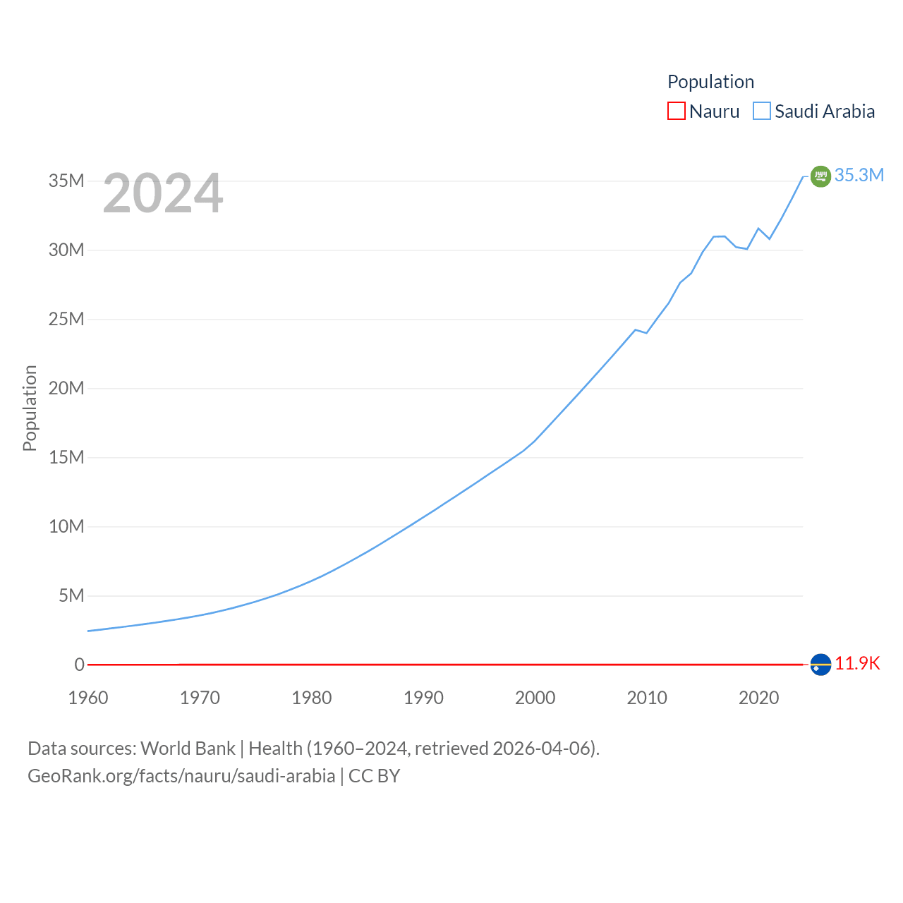 Nauru has a population of 11.9K (ranked 195/197), compared with 35.3M in Saudi Arabia (ranked 45/197). Nauru's land area is 7.72 sq mi versus 830,000 sq mi for Saudi Arabia (ranked 195th vs. 12th).