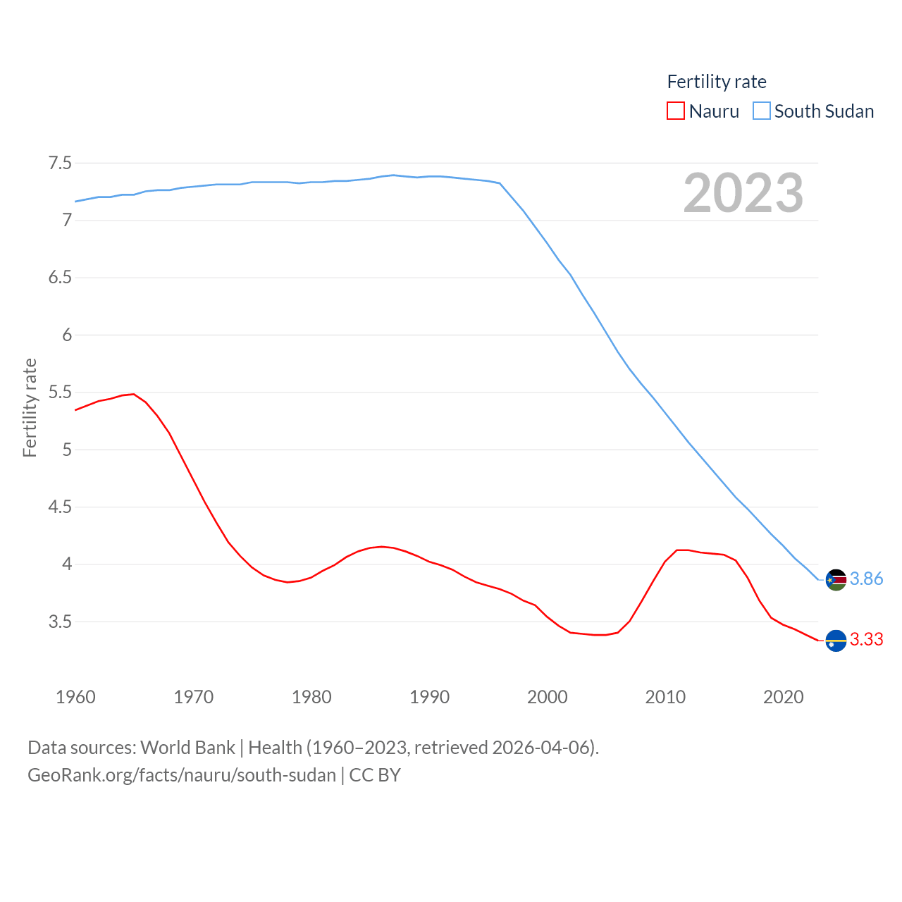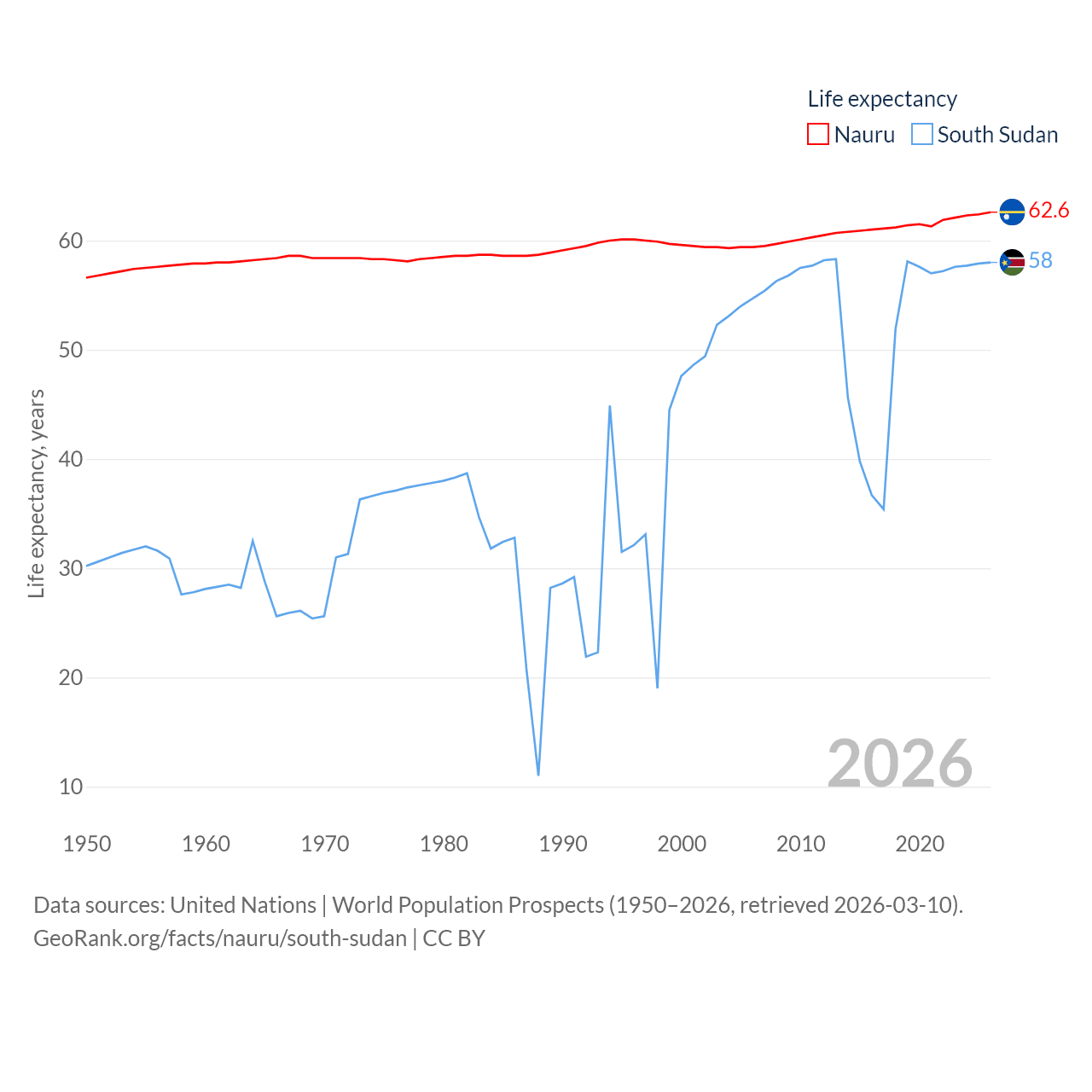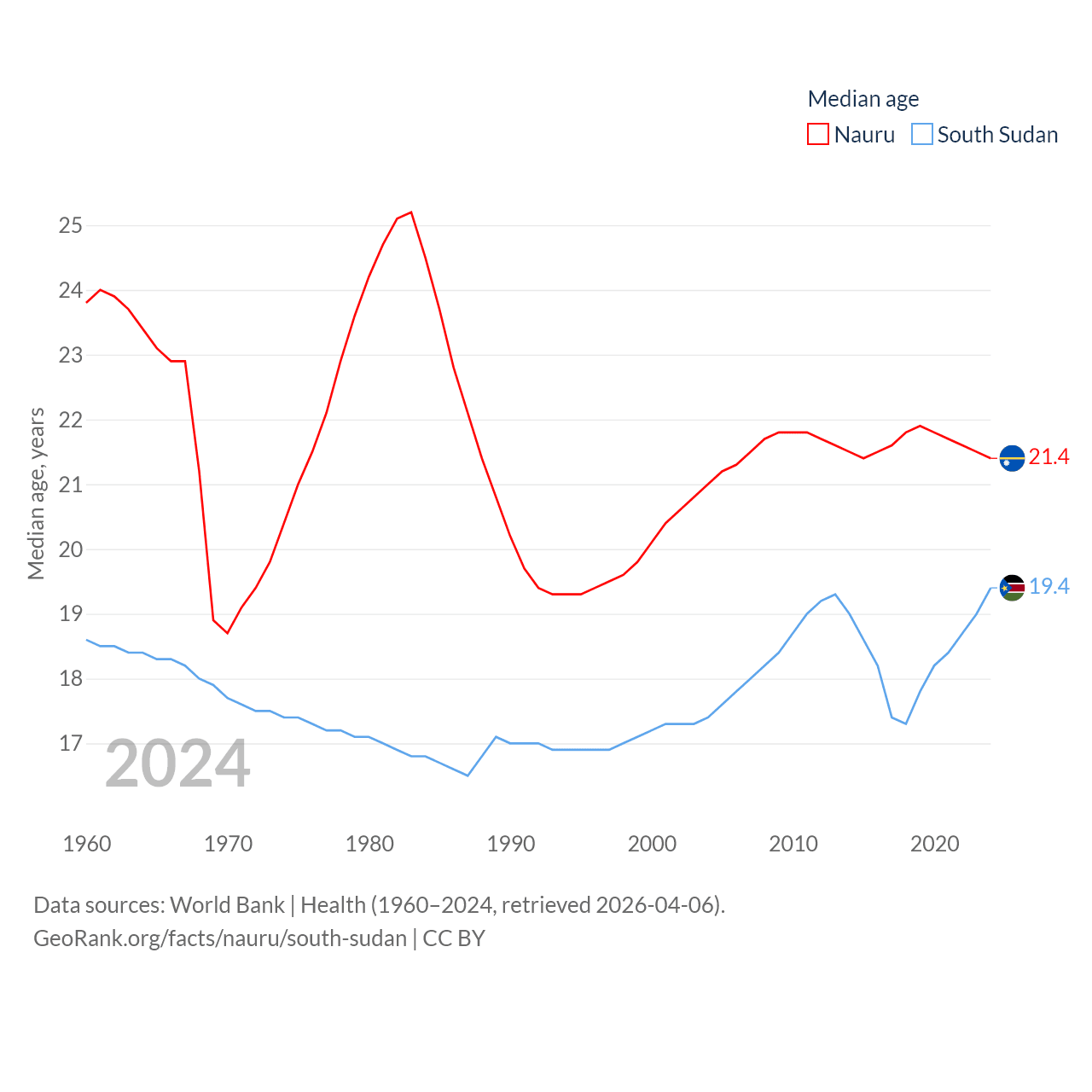 Nauru has a population of 11.9K (ranked 195/197), compared with 11.9M in South Sudan (ranked 81/197). Nauru's land area is 7.72 sq mi versus 243,990 sq mi for South Sudan (ranked 195th vs. 41st).