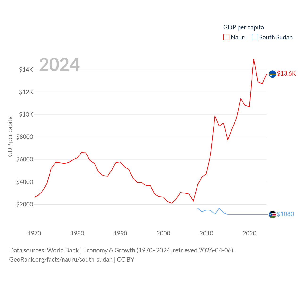 By GDP, Nauru ranks 195/197 ($163M) and South Sudan ranks 149/197 ($12B). By GDP per capita, Nauru ranks 74/197 ($13,609), while South Sudan ranks 175/197 ($1,080).