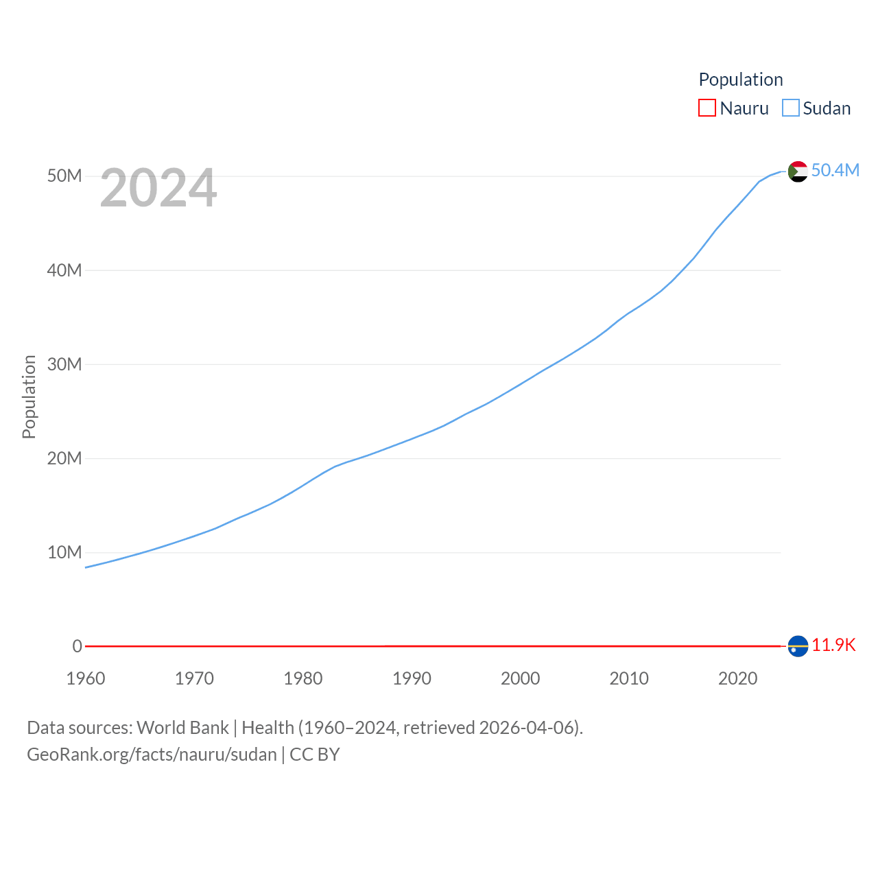 Nauru has a population of 11.9K (ranked 195/197), compared with 50.4M in Sudan (ranked 30/197). Nauru's land area is 7.72 sq mi versus 721,239 sq mi for Sudan (ranked 195th vs. 15th).