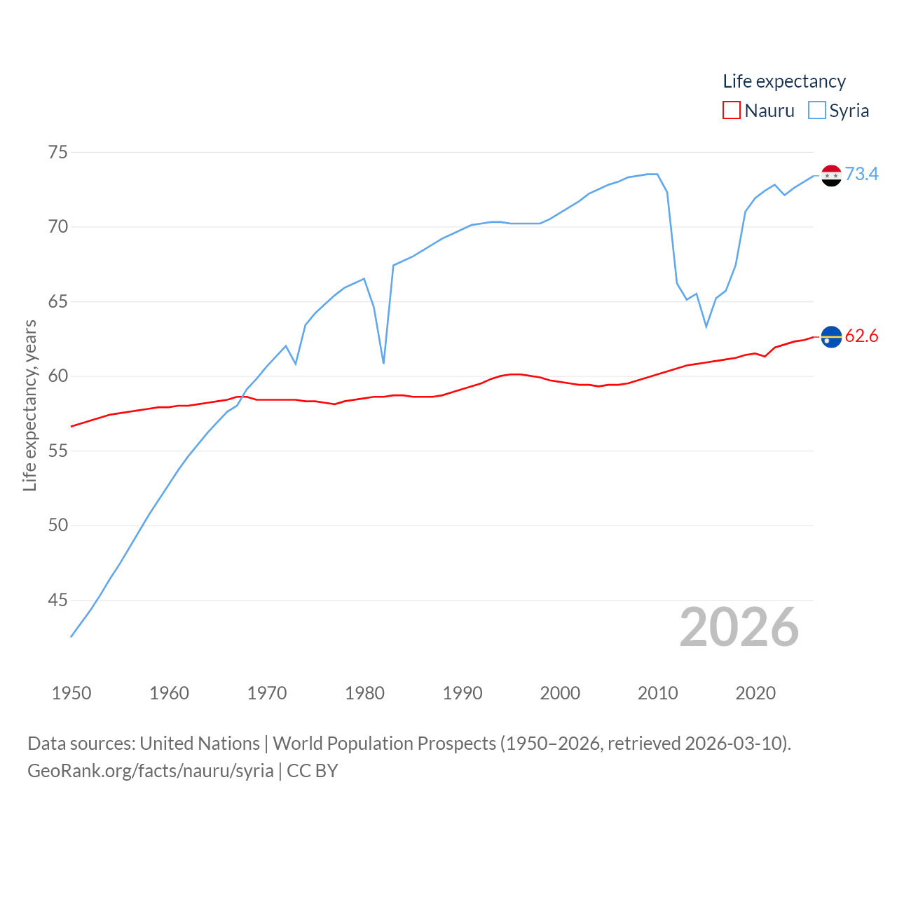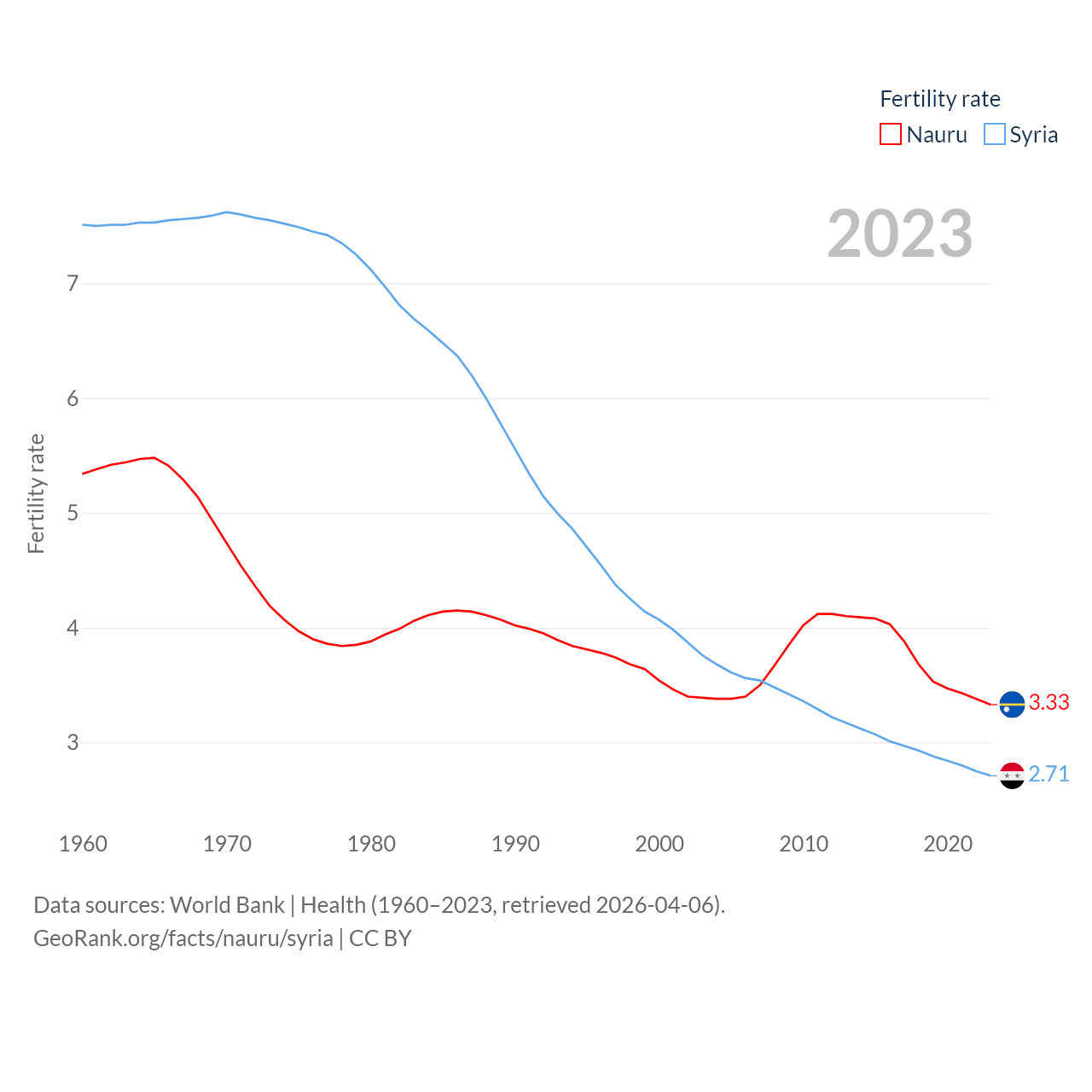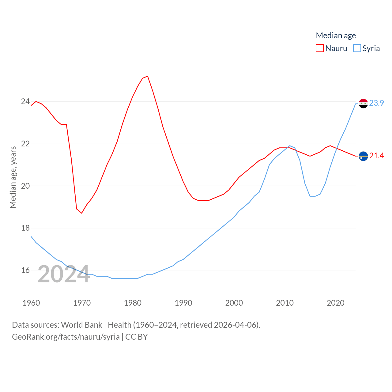Nauru has a population of 11.9K (ranked 195/197), compared with 24.7M in Syria (ranked 57/197). Nauru's land area is 7.72 sq mi versus 70,900 sq mi for Syria (ranked 195th vs. 87th).