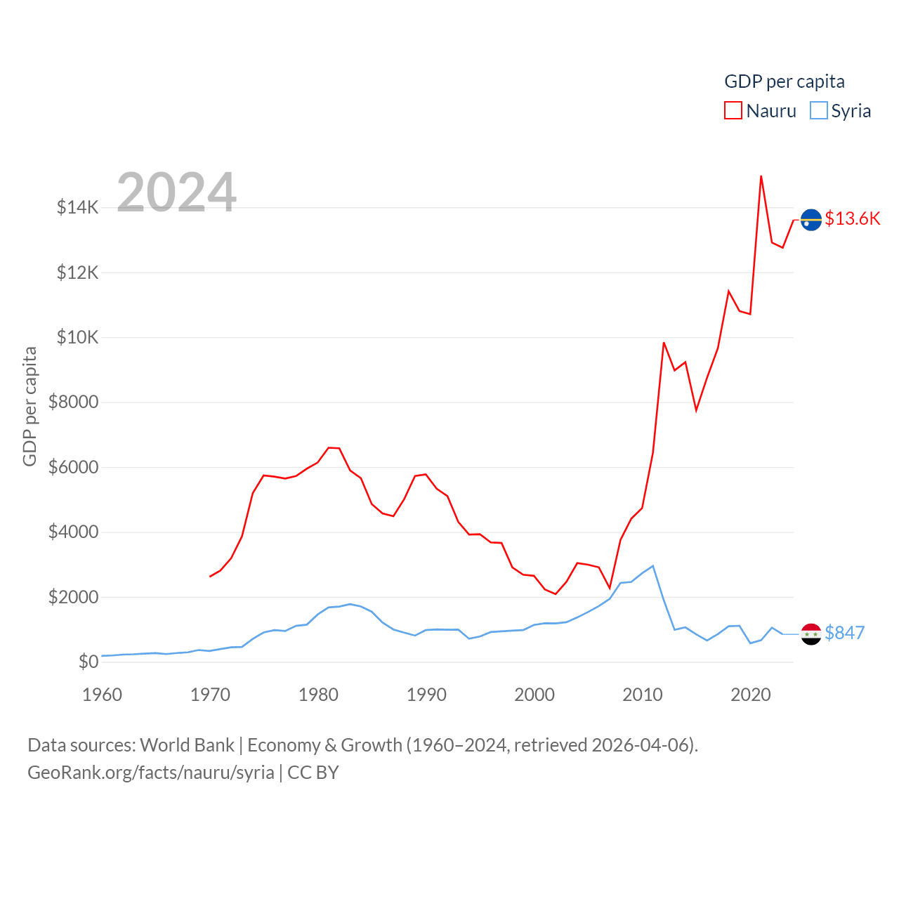 By GDP, Nauru ranks 195/197 ($163M) and Syria ranks 129/197 ($20B). By GDP per capita, Nauru ranks 74/197 ($13,609), while Syria ranks 185/197 ($847).