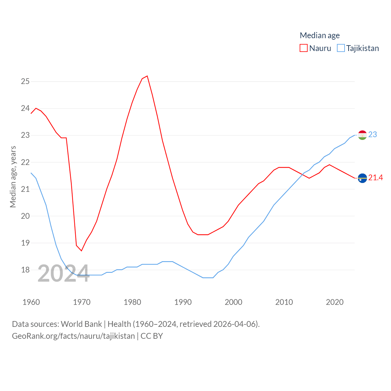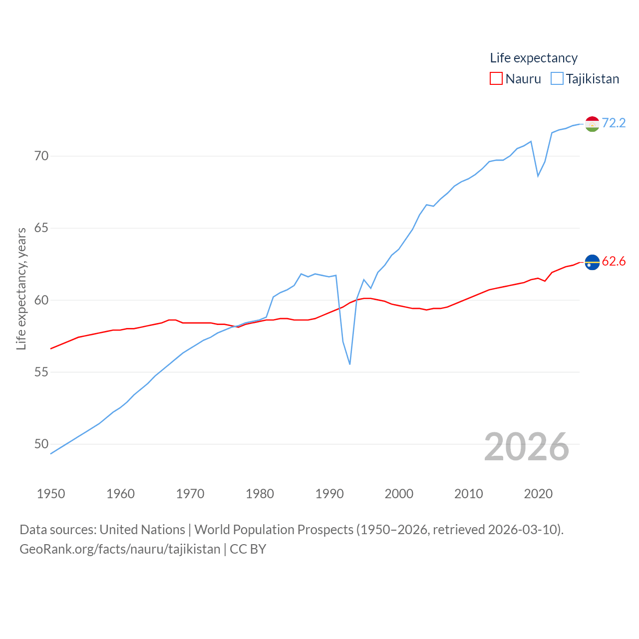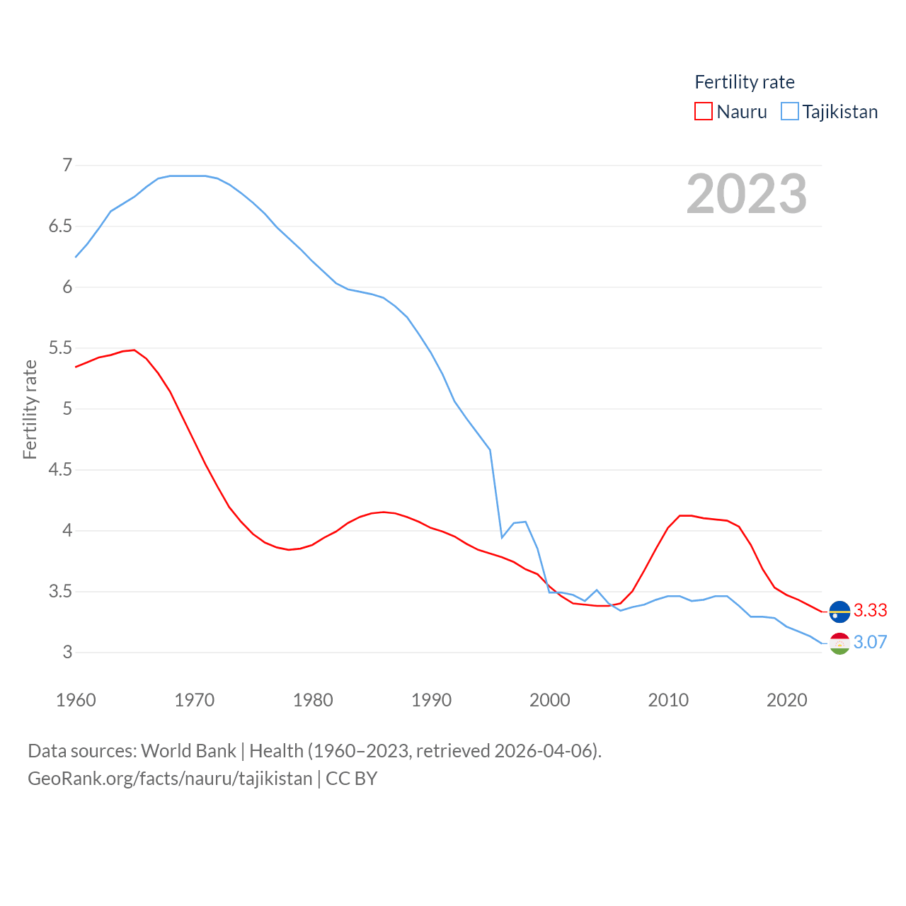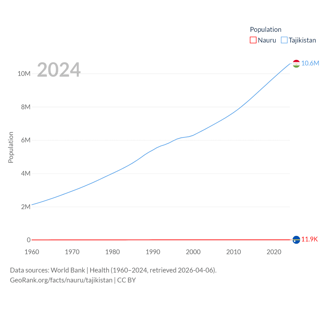 Nauru has a population of 11.9K (ranked 195/197), compared with 10.6M in Tajikistan (ranked 91/197). Nauru's land area is 7.72 sq mi versus 53,587 sq mi for Tajikistan (ranked 195th vs. 93rd).