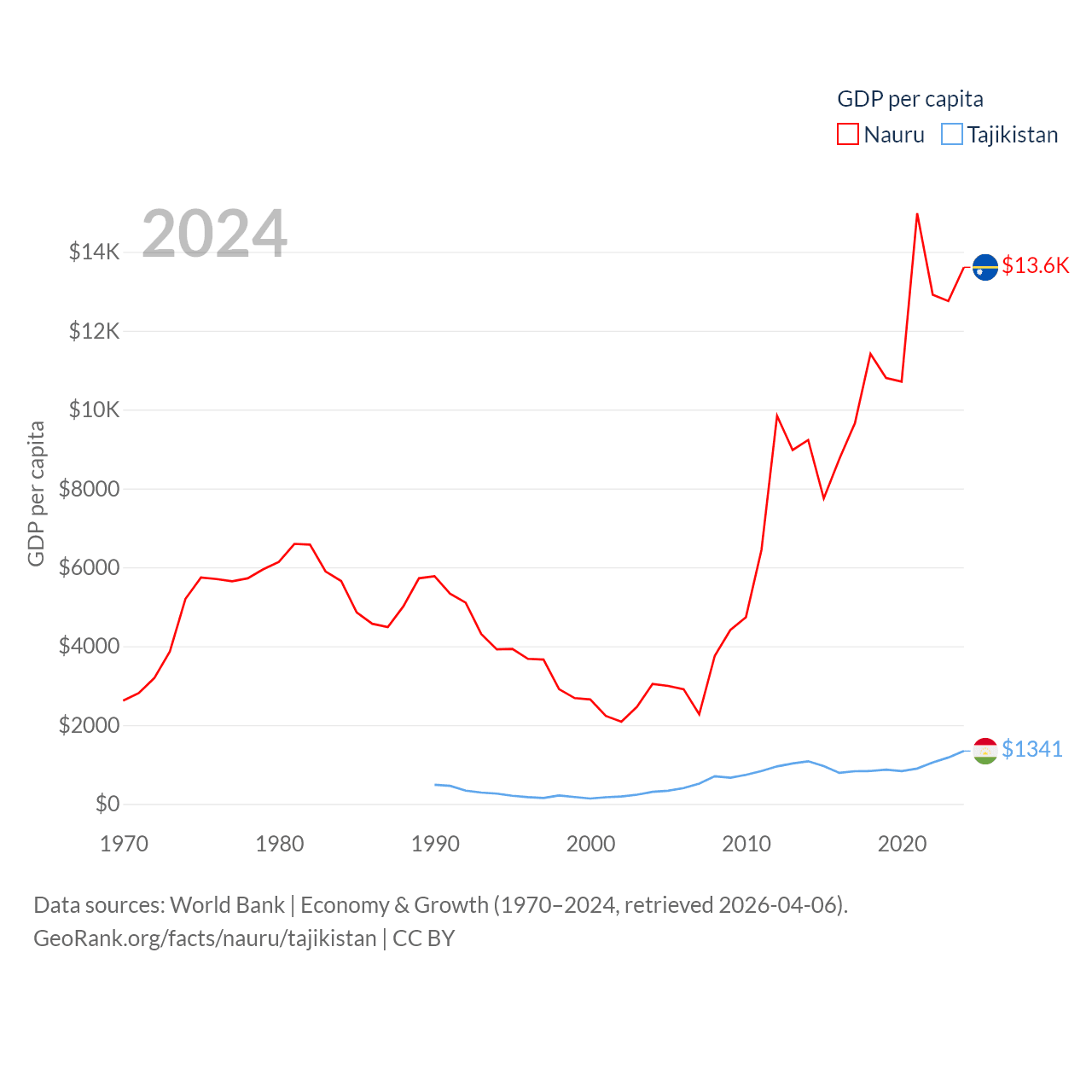 By GDP, Nauru ranks 195/197 ($163M) and Tajikistan ranks 145/197 ($14.2B). By GDP per capita, Nauru ranks 74/197 ($13,609), while Tajikistan ranks 166/197 ($1,341).