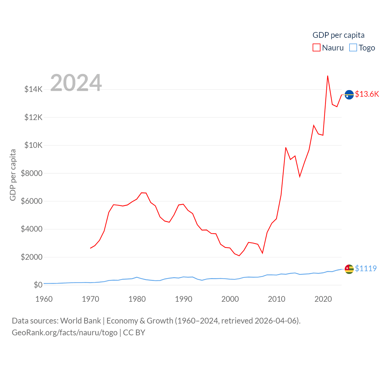 By GDP, Nauru ranks 195/197 ($163M) and Togo ranks 154/197 ($10.7B). By GDP per capita, Nauru ranks 74/197 ($13,609), while Togo ranks 172/197 ($1,119).