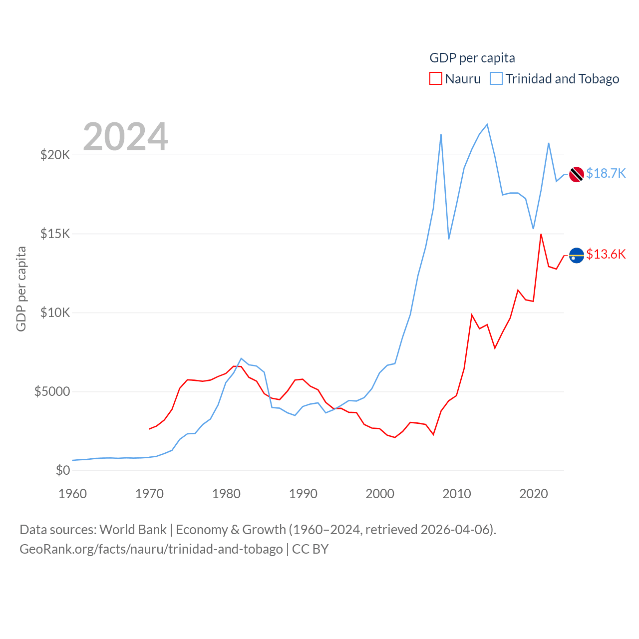 By GDP, Nauru ranks 195/197 ($163M) and Trinidad and Tobago ranks 115/197 ($25.6B). By GDP per capita, Nauru ranks 74/197 ($13,609), while Trinidad and Tobago ranks 61/197 ($18,733).
