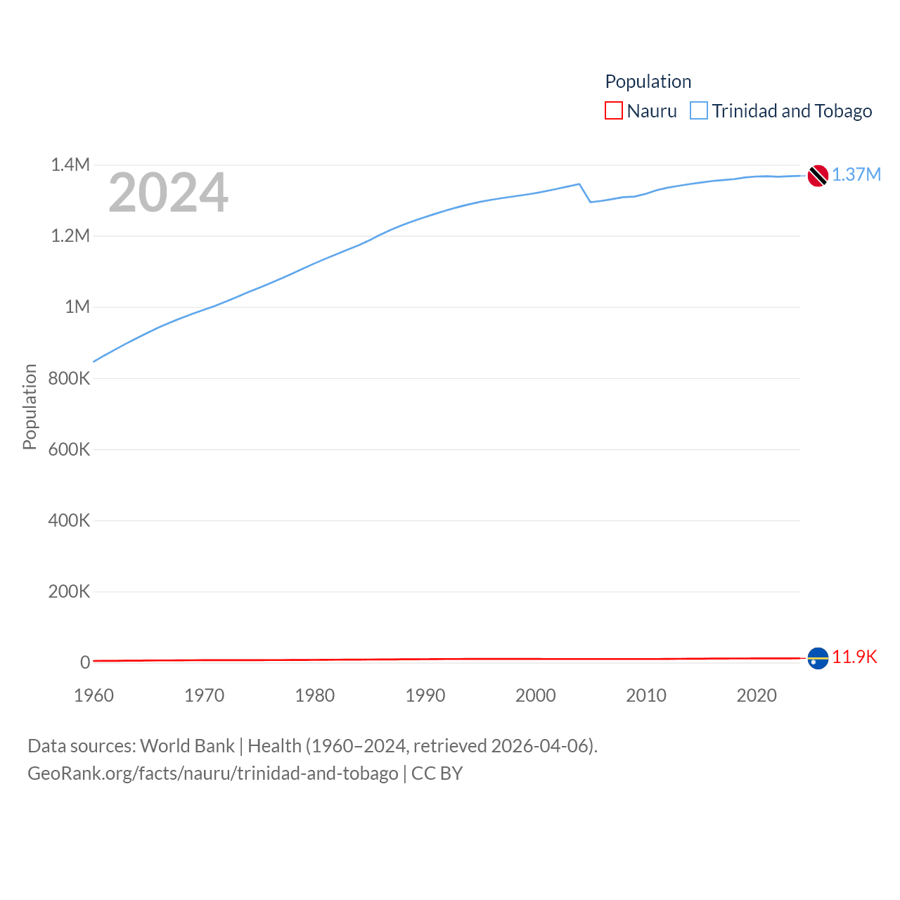 Nauru has a population of 11.9K (ranked 195/197), compared with 1.37M in Trinidad and Tobago (ranked 154/197). Nauru's land area is 7.72 sq mi versus 1,981 sq mi for Trinidad and Tobago (ranked 195th vs. 166th).