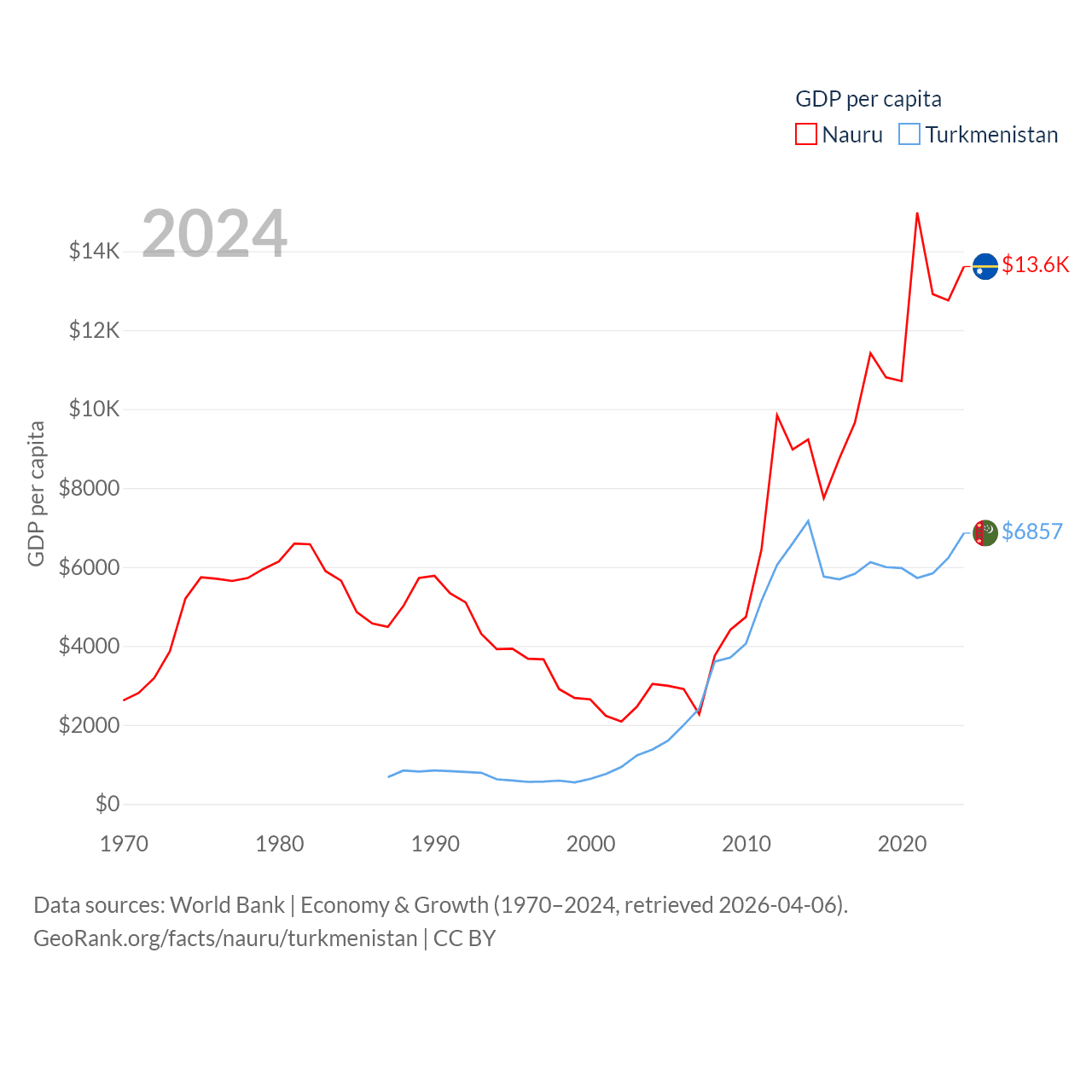 By GDP, Nauru ranks 195/197 ($163M) and Turkmenistan ranks 92/197 ($51.4B). By GDP per capita, Nauru ranks 74/197 ($13,609), while Turkmenistan ranks 104/197 ($6,857).