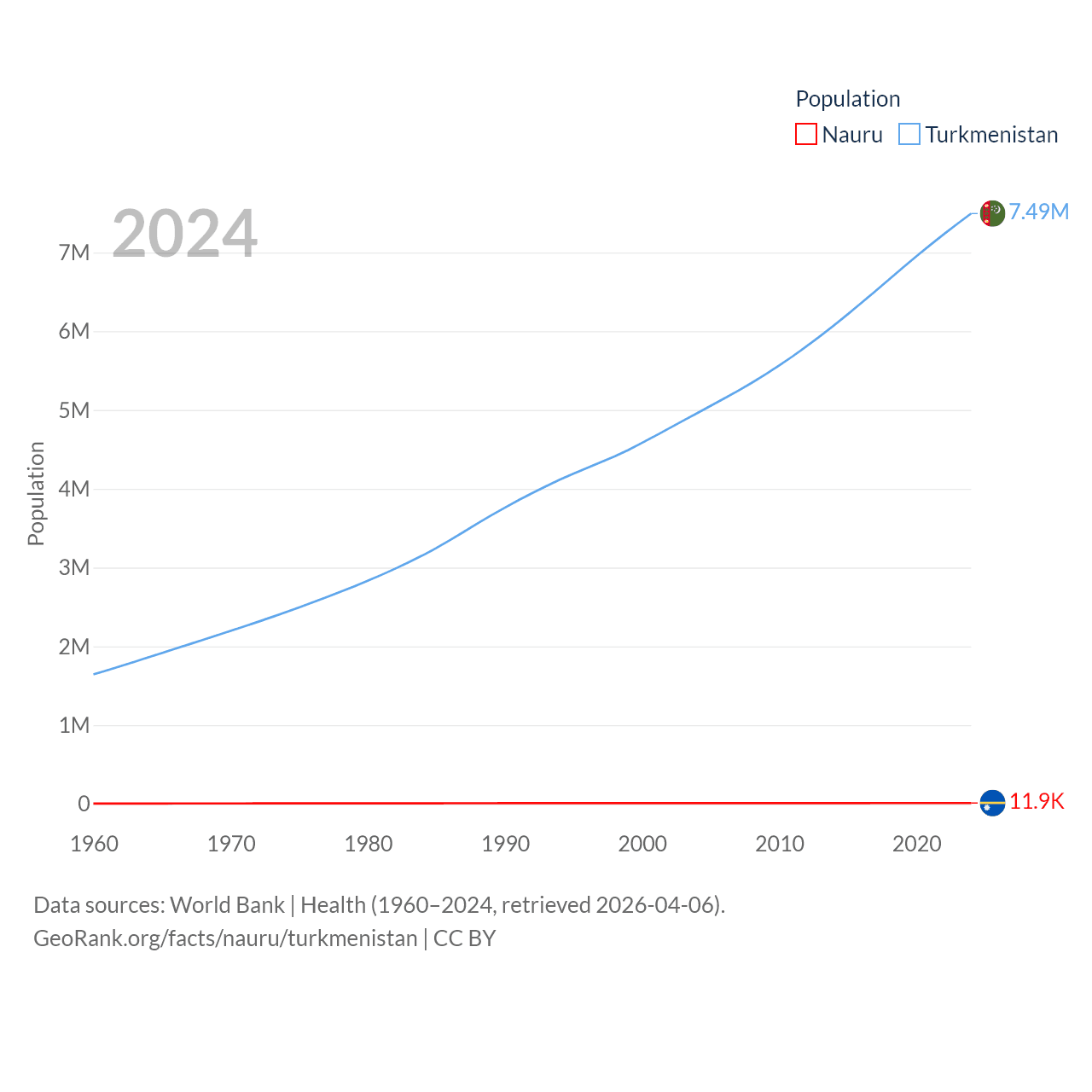 Nauru has a population of 11.9K (ranked 195/197), compared with 7.49M in Turkmenistan (ranked 104/197). Nauru's land area is 7.72 sq mi versus 181,441 sq mi for Turkmenistan (ranked 195th vs. 53rd).