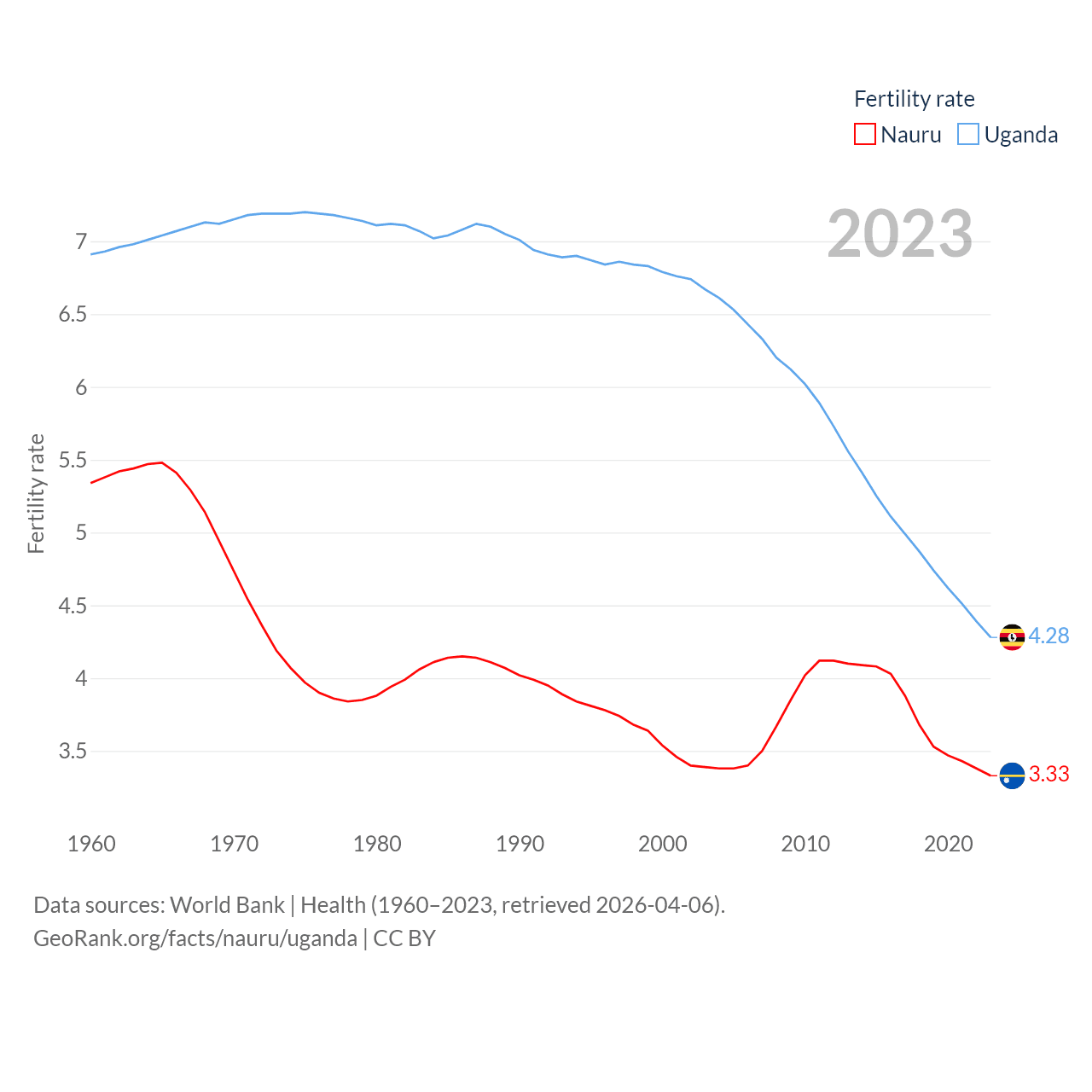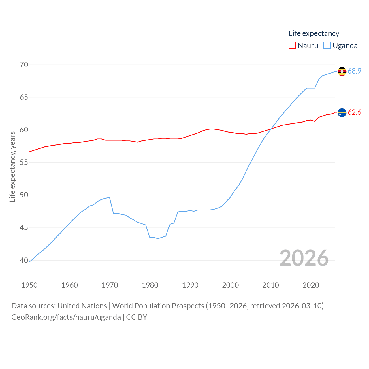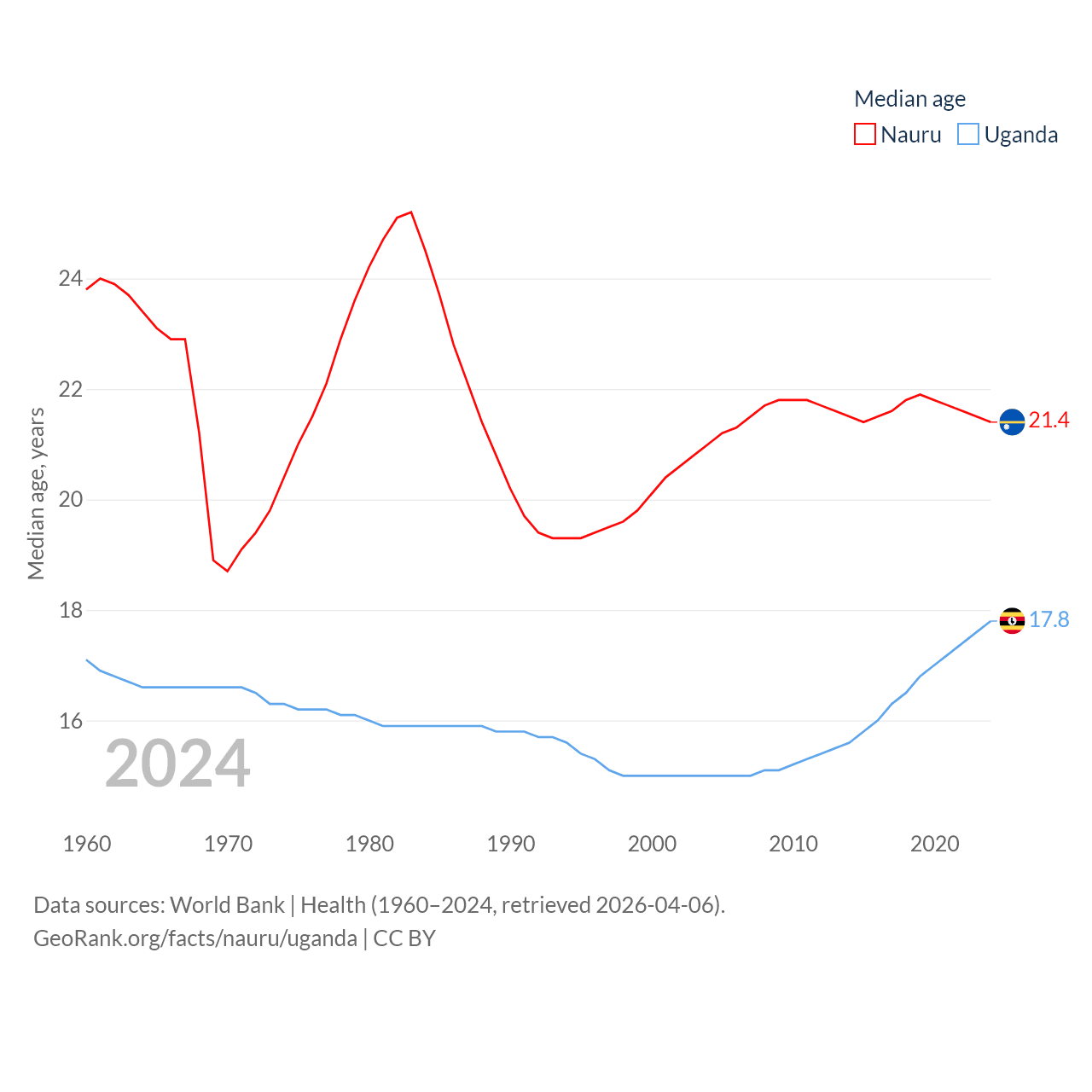 Nauru has a population of 11.9K (ranked 195/197), compared with 50M in Uganda (ranked 31/197). Nauru's land area is 7.72 sq mi versus 77,421 sq mi for Uganda (ranked 195th vs. 84th).
