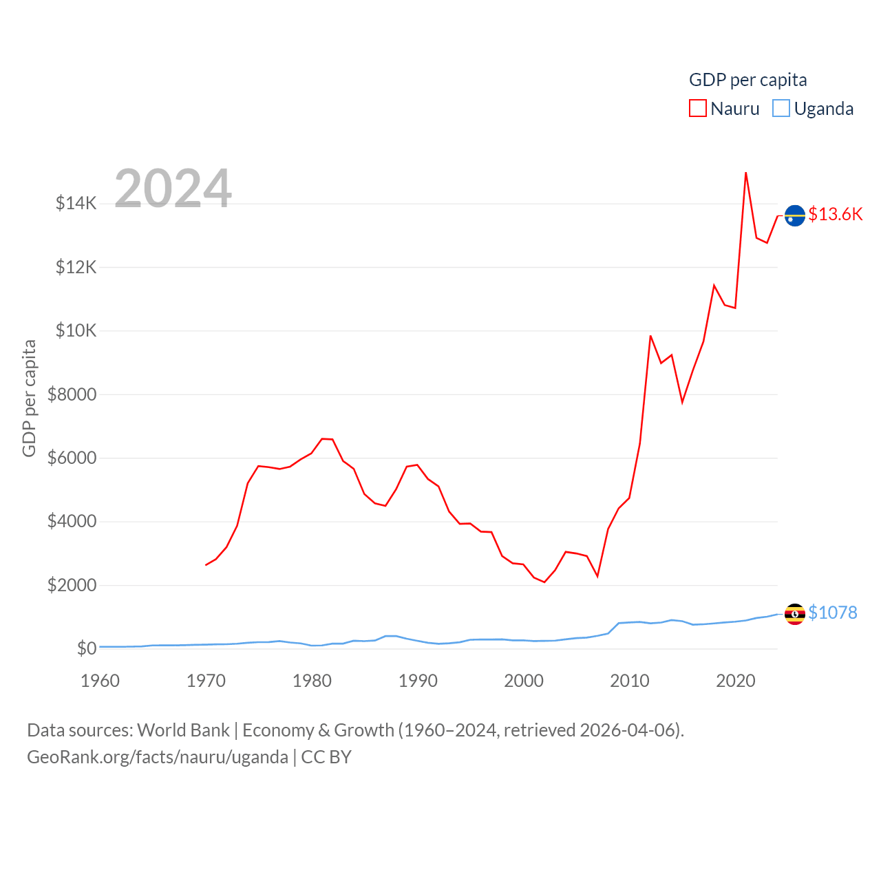 By GDP, Nauru ranks 195/197 ($163M) and Uganda ranks 89/197 ($53.9B). By GDP per capita, Nauru ranks 74/197 ($13,609), while Uganda ranks 176/197 ($1,078).