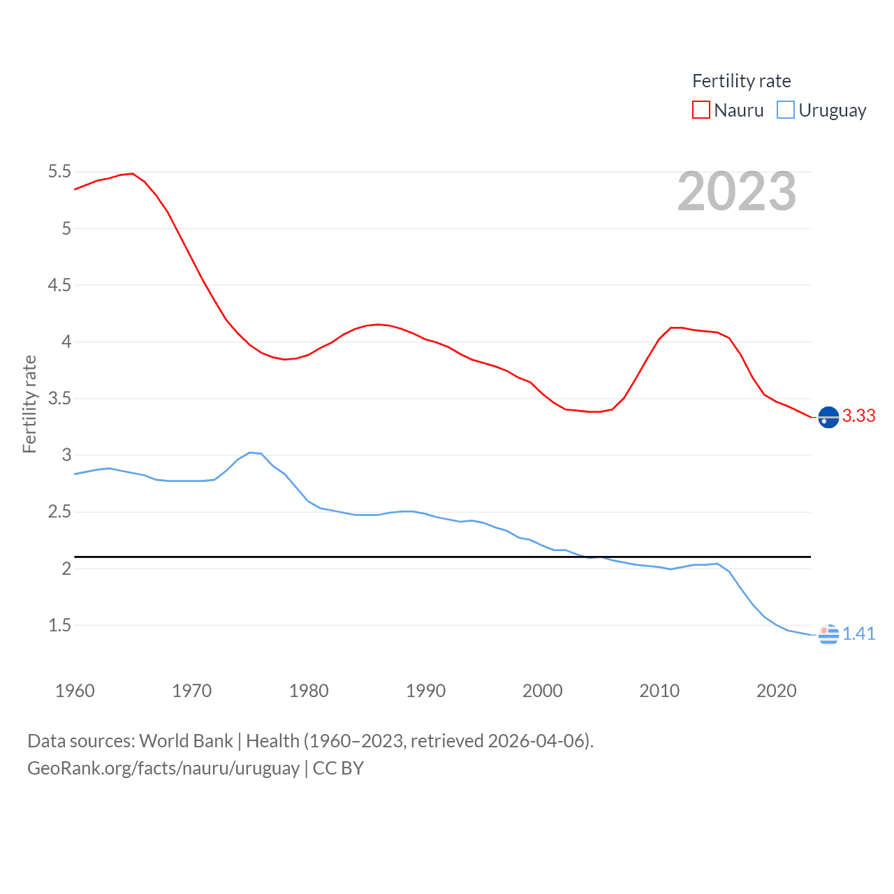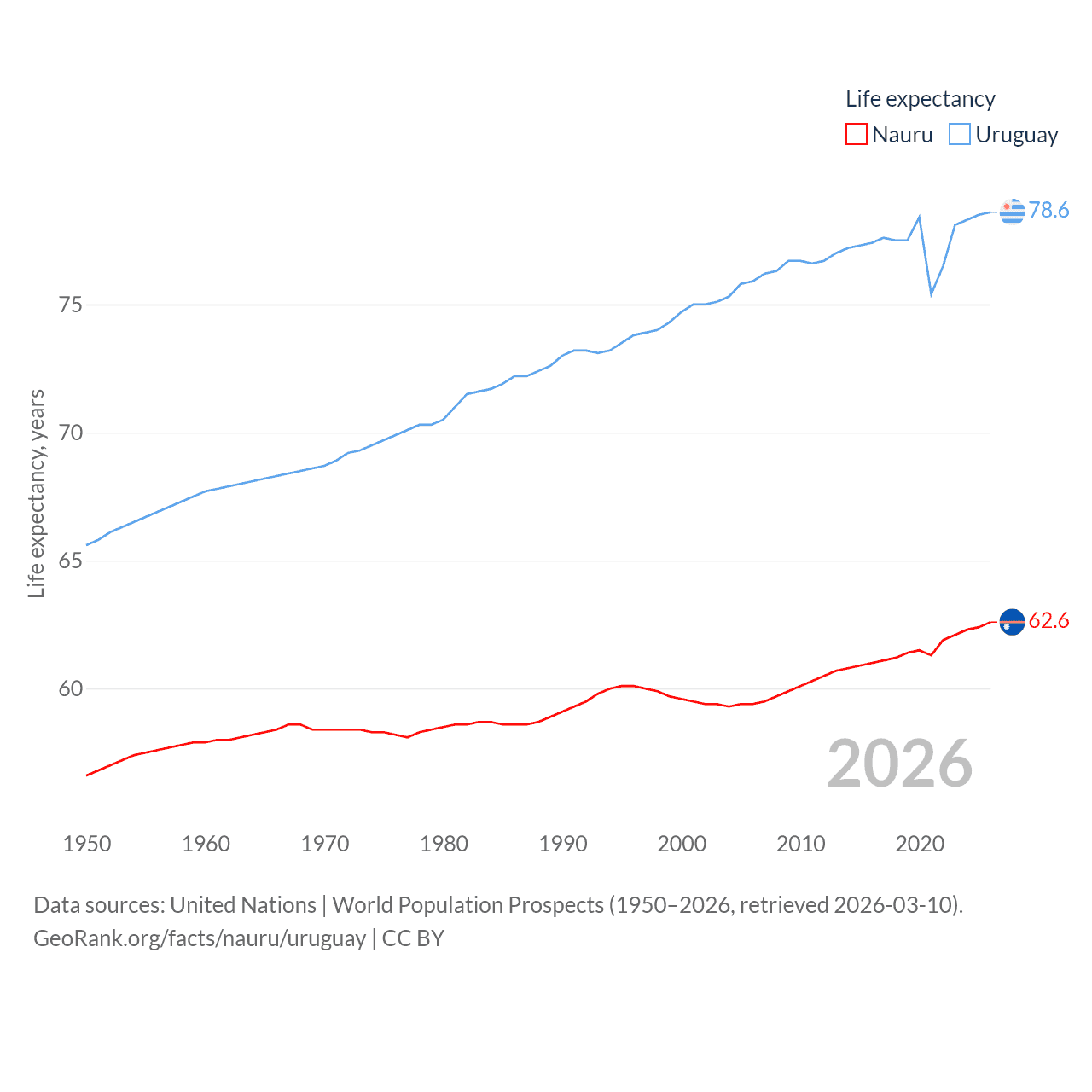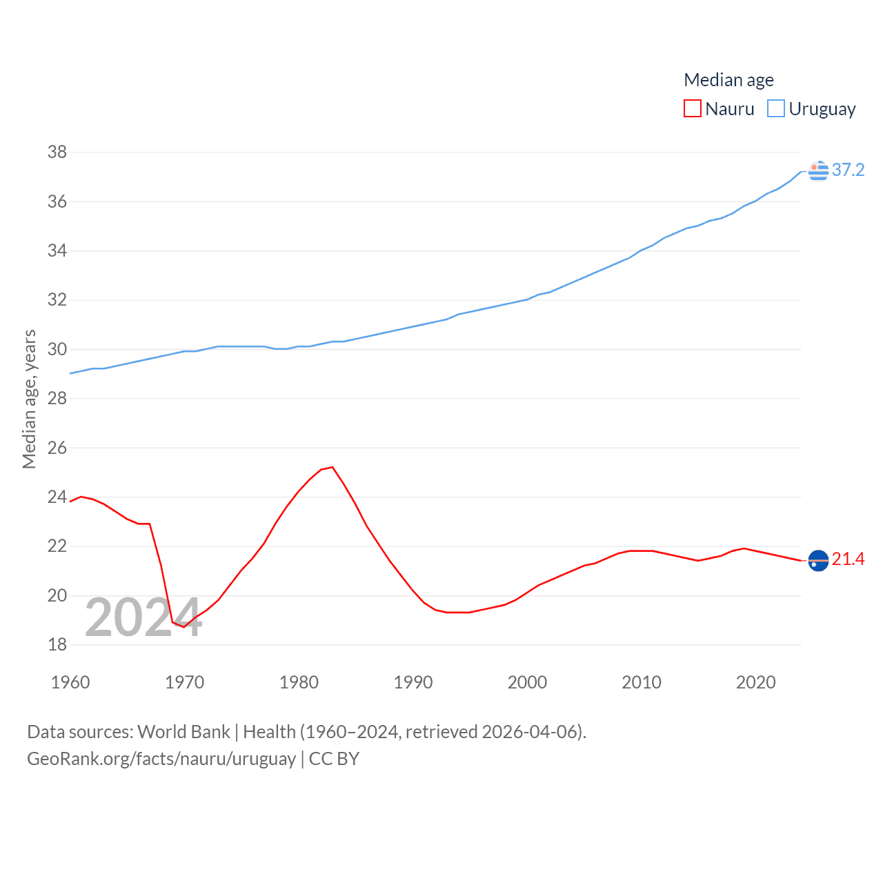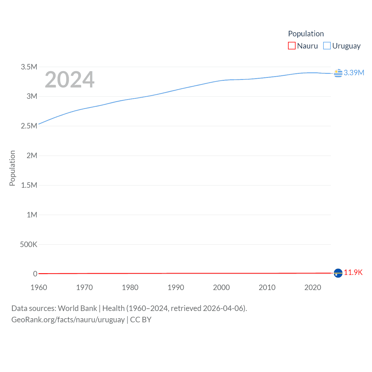 Nauru has a population of 11.9K (ranked 195/197), compared with 3.39M in Uruguay (ranked 133/197). Nauru's land area is 7.72 sq mi versus 67,576 sq mi for Uruguay (ranked 195th vs. 89th).