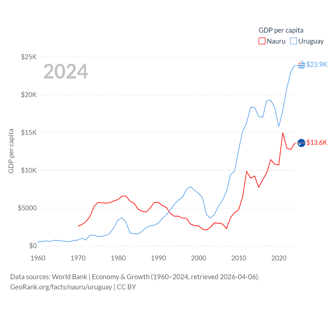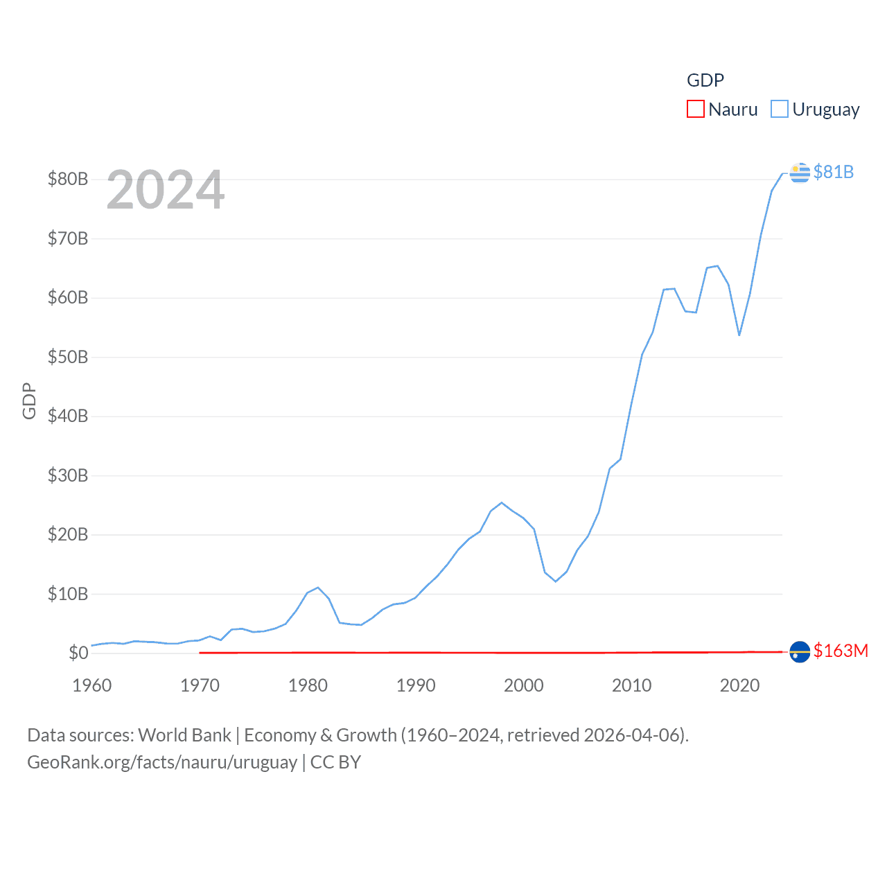 By GDP, Nauru ranks 195/197 ($163M) and Uruguay ranks 81/197 ($81B). By GDP per capita, Nauru ranks 74/197 ($13,609), while Uruguay ranks 52/197 ($23,907).