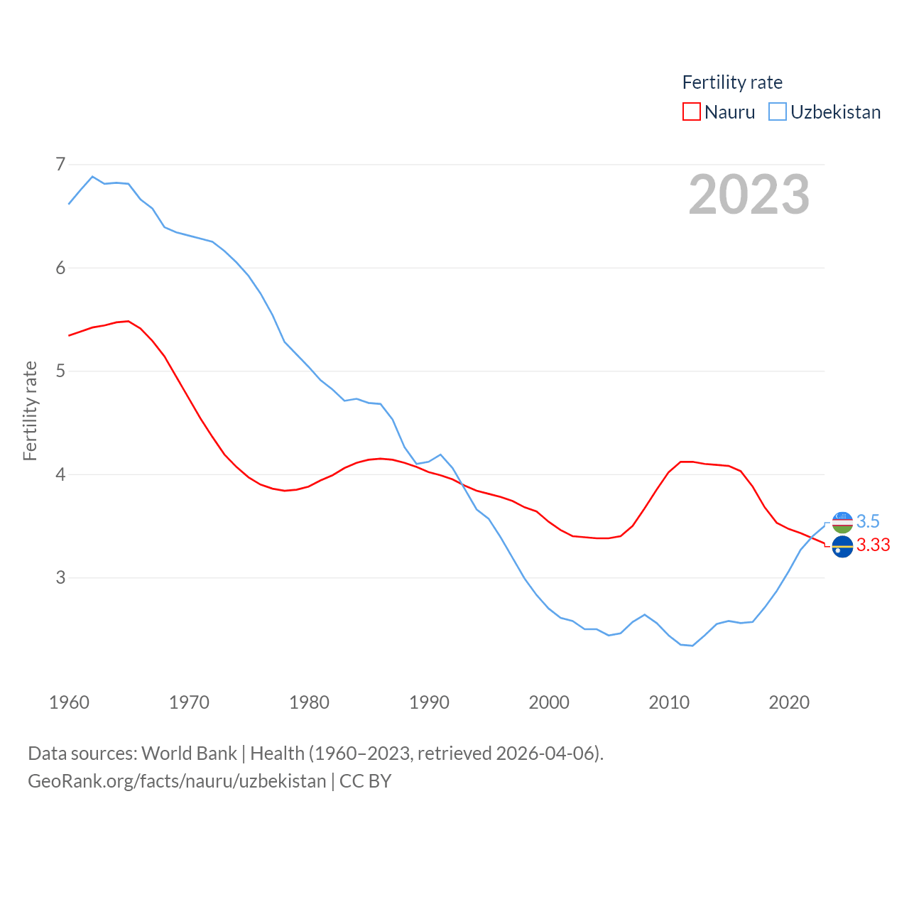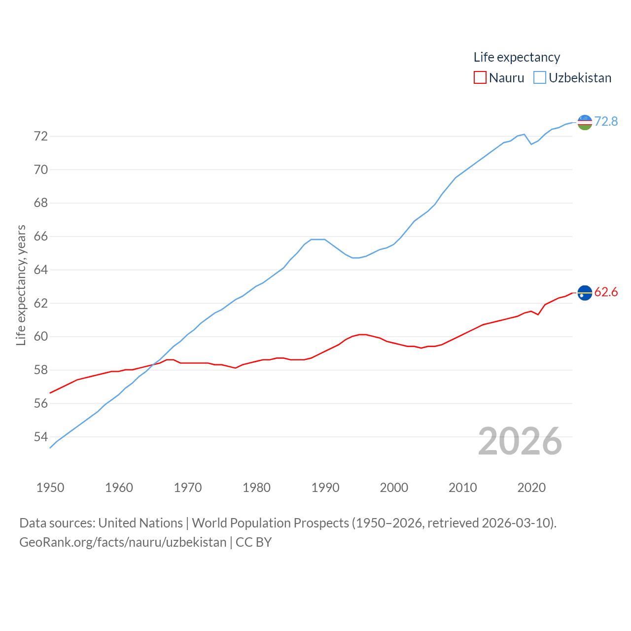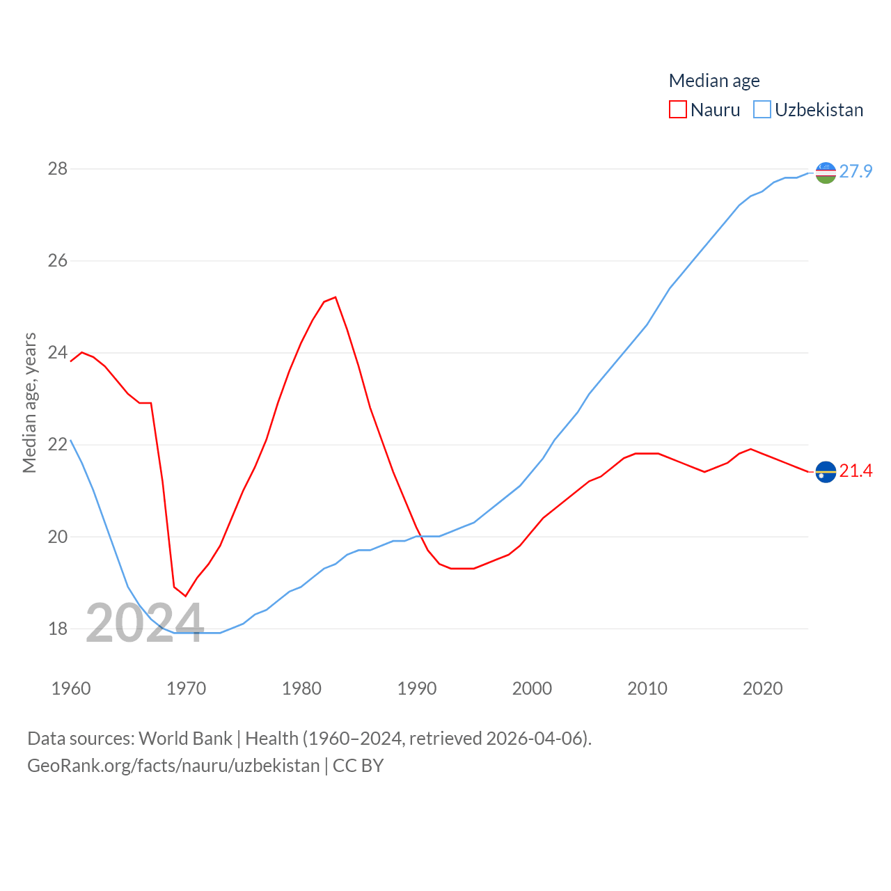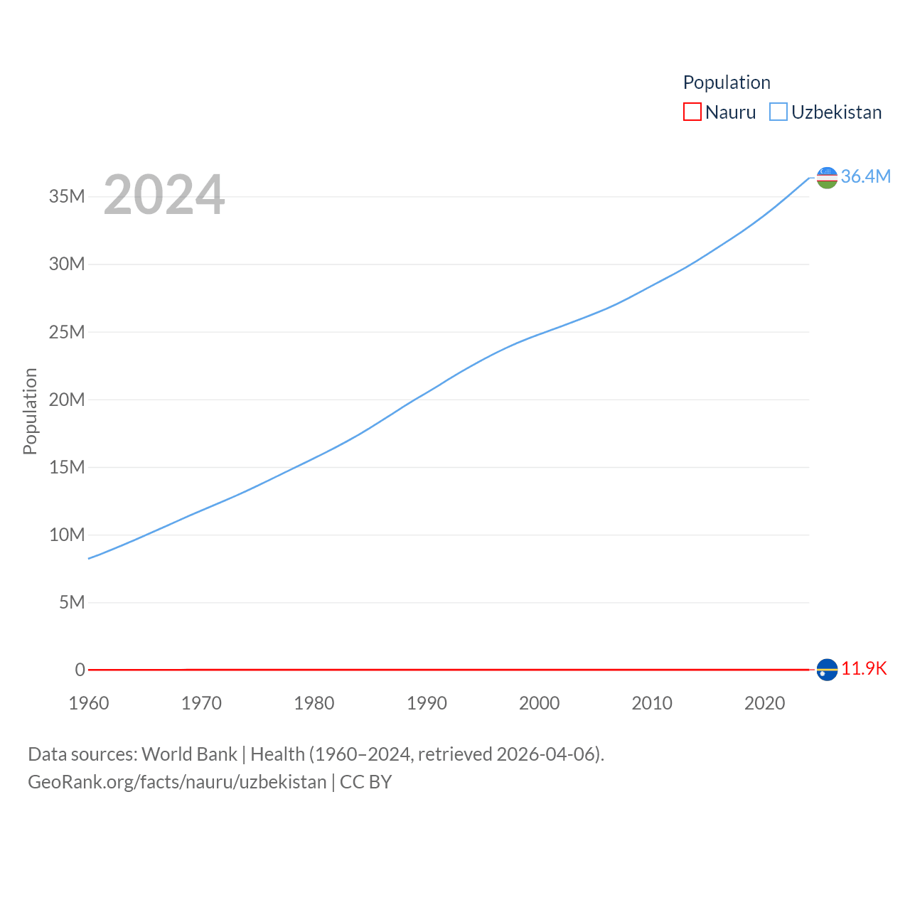 Nauru has a population of 11.9K (ranked 195/197), compared with 36.4M in Uzbekistan (ranked 43/197). Nauru's land area is 7.72 sq mi versus 170,136 sq mi for Uzbekistan (ranked 195th vs. 56th).