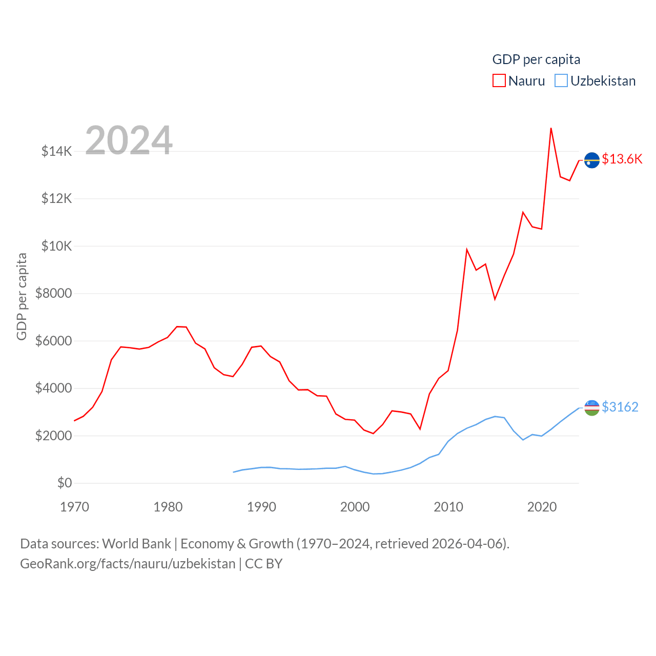 By GDP, Nauru ranks 195/197 ($163M) and Uzbekistan ranks 66/197 ($115B). By GDP per capita, Nauru ranks 74/197 ($13,609), while Uzbekistan ranks 139/197 ($3,162).
