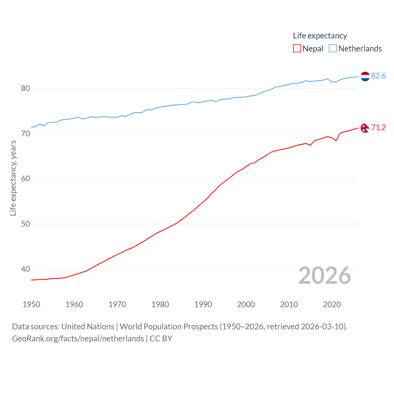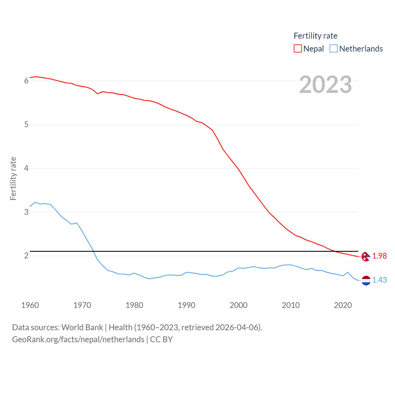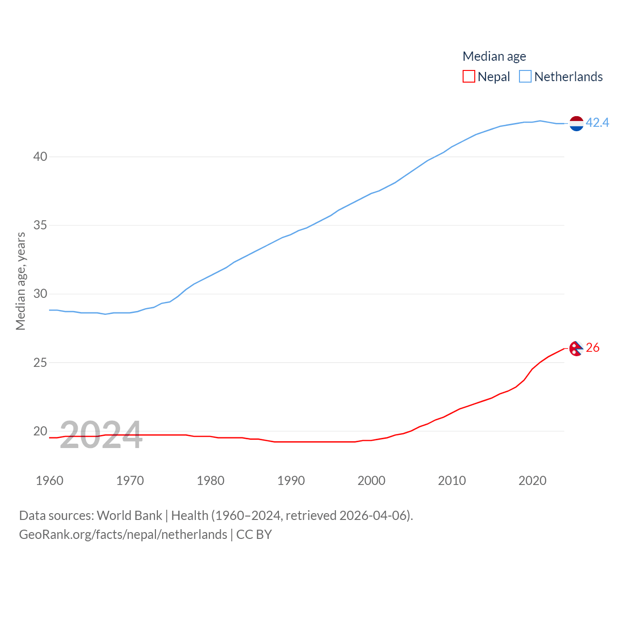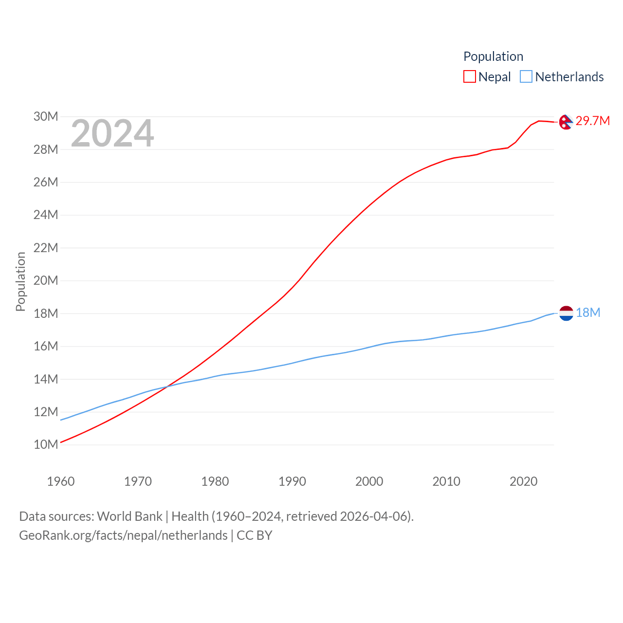 Nepal has a population of 29.7M (ranked 51/197), compared with 18M in The Netherlands (ranked 72/197). Nepal's land area is 55,348 sq mi versus 13,000 sq mi for The Netherlands (ranked 92nd vs. 134th).