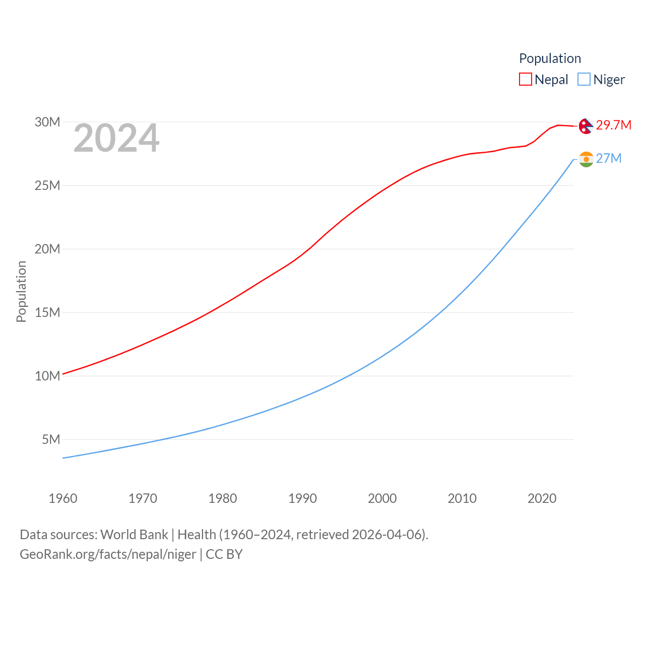 Nepal has a population of 29.7M (ranked 51/197), compared with 27M in Niger (ranked 55/197). Nepal's land area is 55,348 sq mi versus 489,076 sq mi for Niger (ranked 92nd vs. 20th).