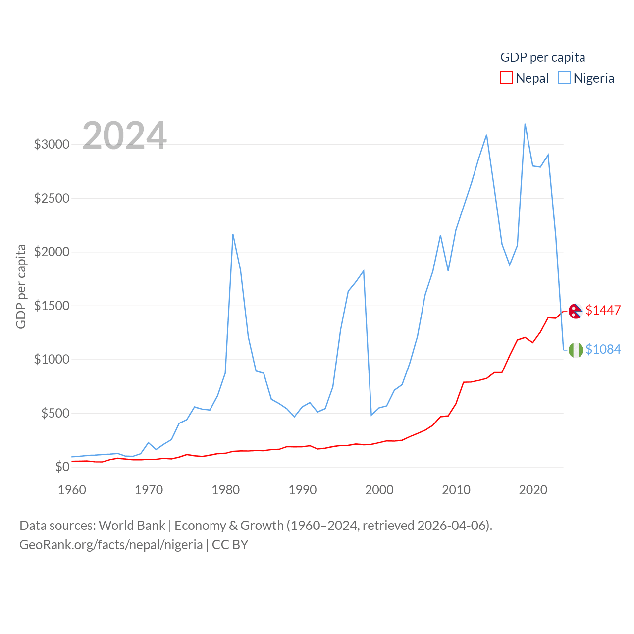 By GDP, Nepal ranks 101/197 ($42.9B) and Nigeria ranks 54/197 ($252B). By GDP per capita, Nepal ranks 164/197 ($1,447), while Nigeria ranks 174/197 ($1,084).