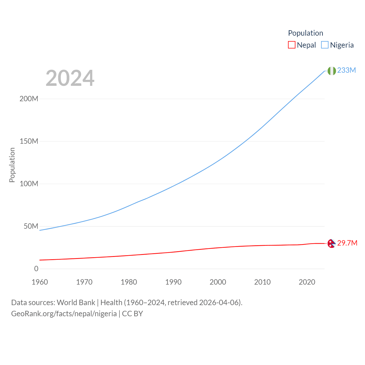 Nepal has a population of 29.7M (ranked 51/197), compared with 233M in Nigeria (ranked 6/197). Nepal's land area is 55,348 sq mi versus 351,650 sq mi for Nigeria (ranked 92nd vs. 30th).