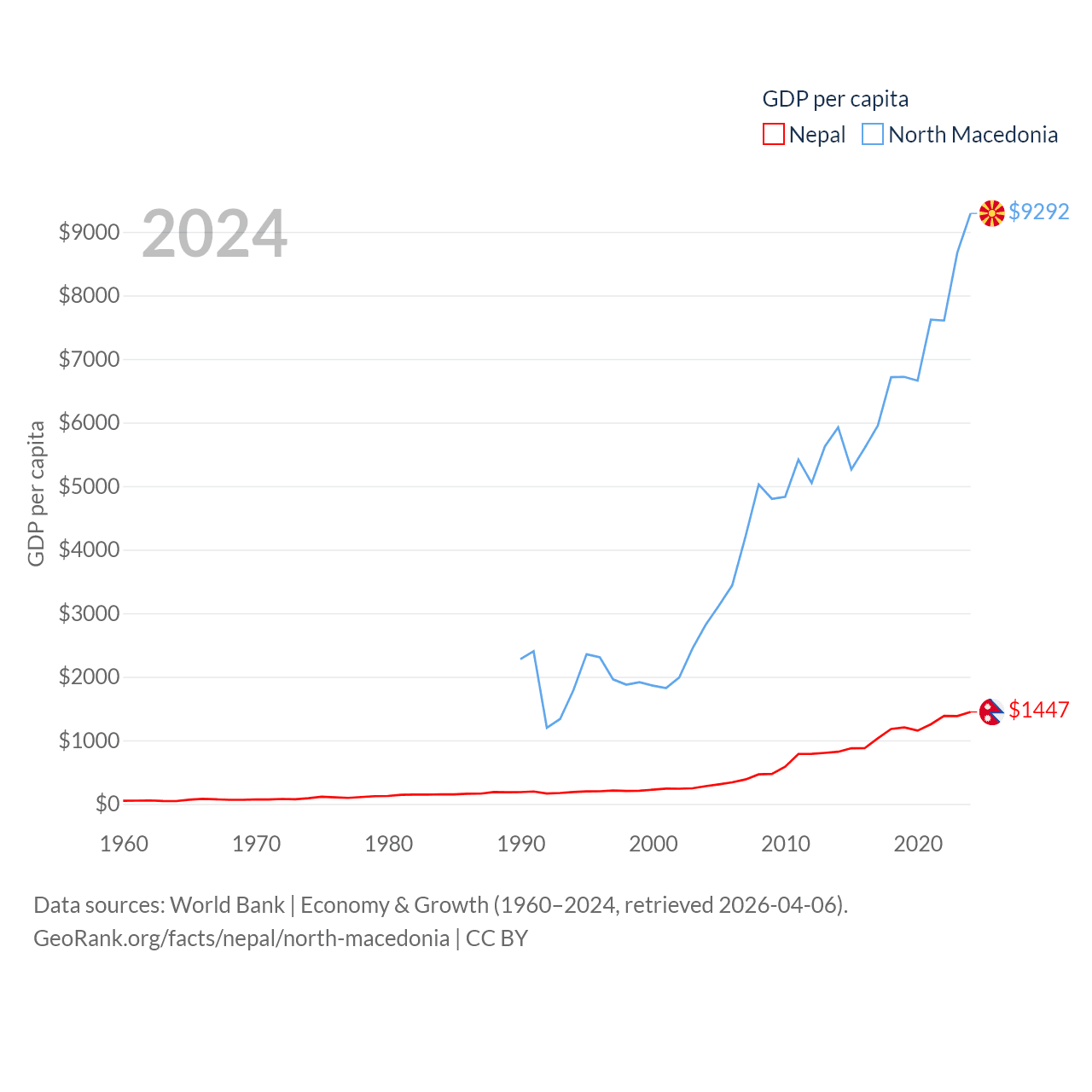 By GDP, Nepal ranks 101/197 ($42.9B) and North Macedonia ranks 138/197 ($17B). By GDP per capita, Nepal ranks 164/197 ($1,447), while North Macedonia ranks 88/197 ($9,292).