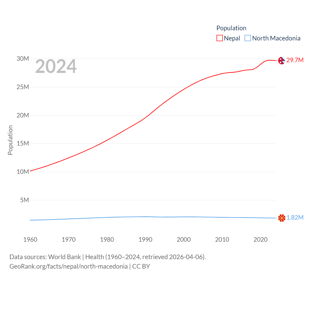 Nepal has a population of 29.7M (ranked 51/197), compared with 1.82M in North Macedonia (ranked 150/197). Nepal's land area is 55,348 sq mi versus 9,737 sq mi for North Macedonia (ranked 92nd vs. 145th).