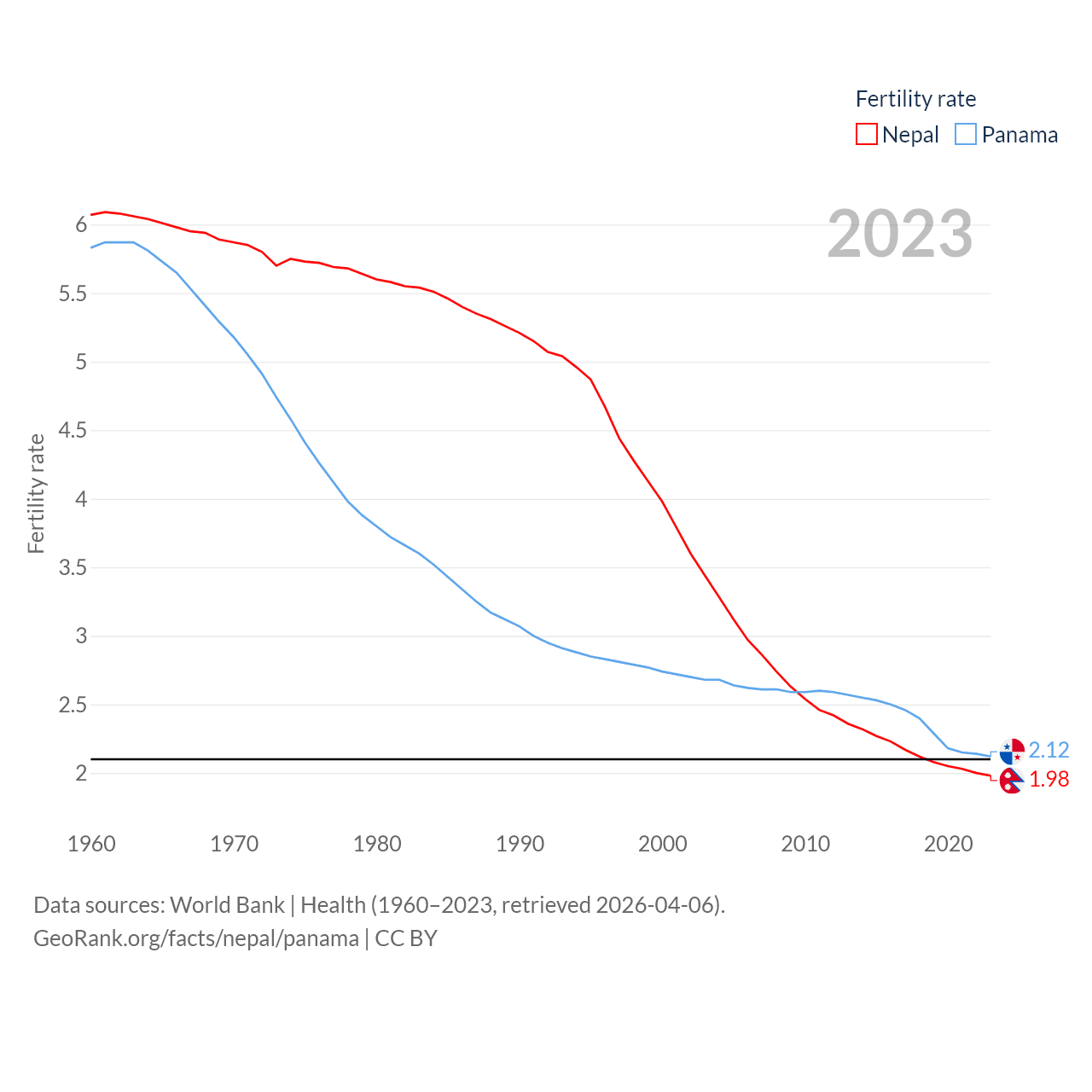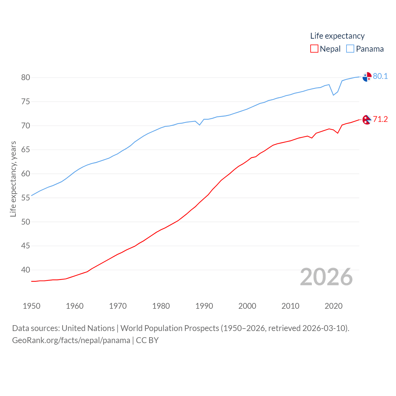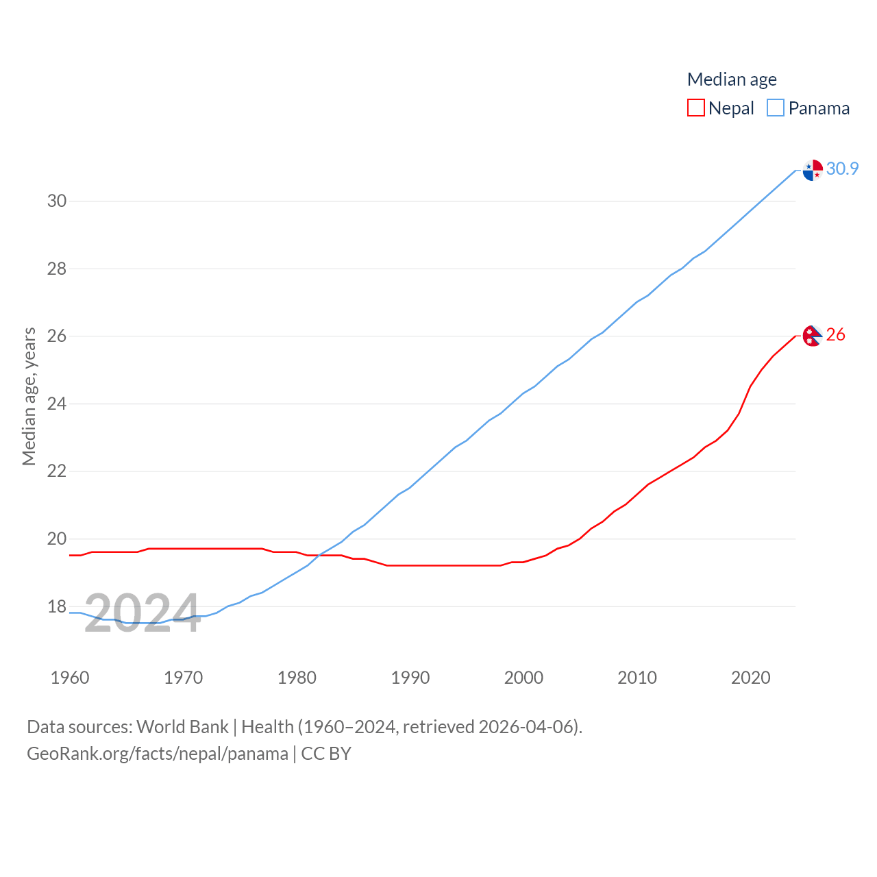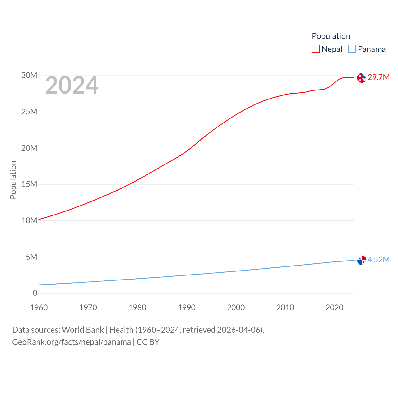 Nepal has a population of 29.7M (ranked 51/197), compared with 4.52M in Panama (ranked 128/197). Nepal's land area is 55,348 sq mi versus 28,641 sq mi for Panama (ranked 92nd vs. 115th).