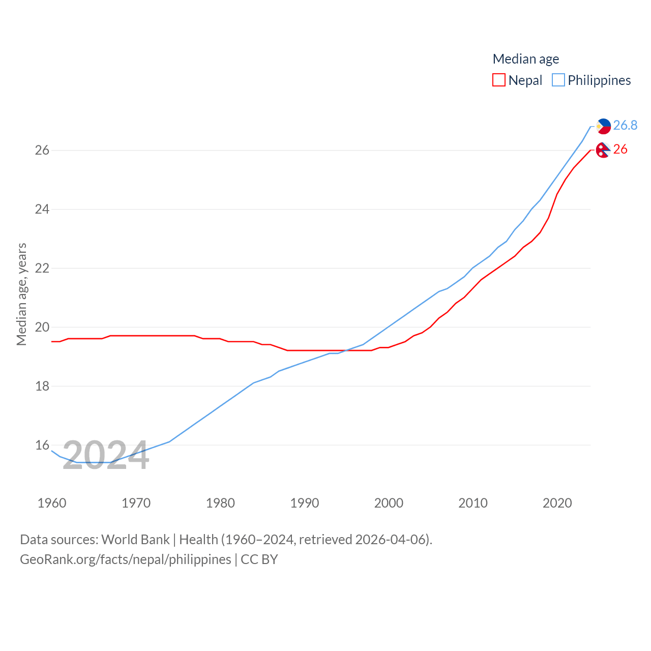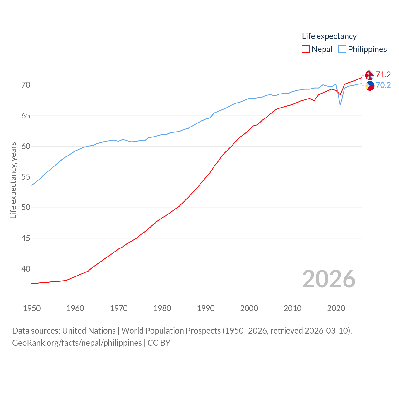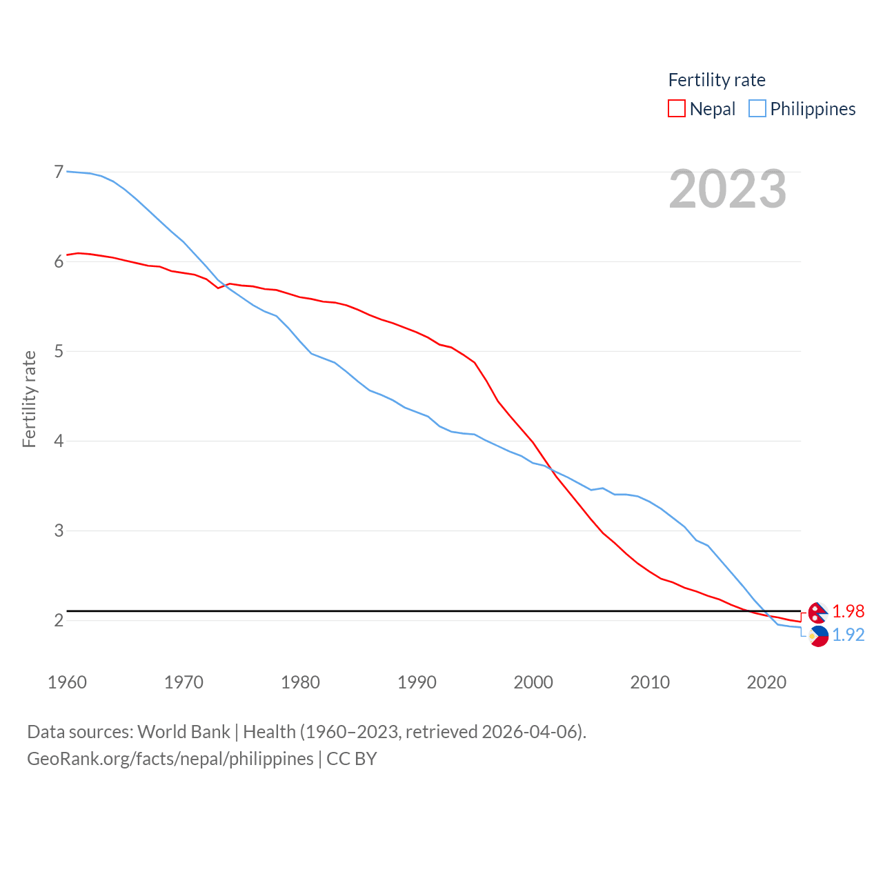 Nepal has a population of 29.7M (ranked 51/197), compared with 116M in The Philippines (ranked 14/197). Nepal's land area is 55,348 sq mi versus 115,124 sq mi for The Philippines (ranked 92nd vs. 71st).