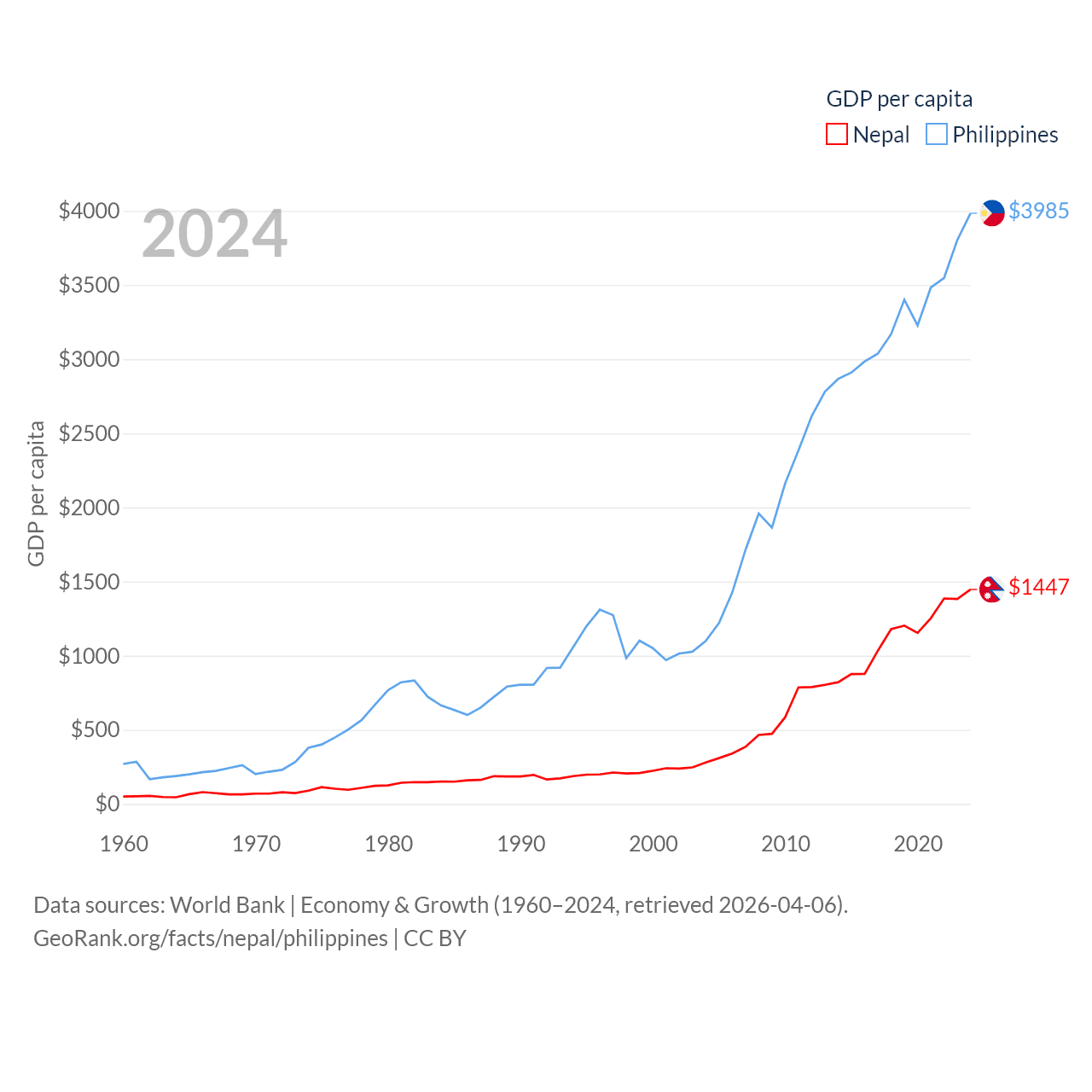 By GDP, Nepal ranks 101/197 ($42.9B) and The Philippines ranks 35/197 ($462B). By GDP per capita, Nepal ranks 164/197 ($1,447), while The Philippines ranks 130/197 ($3,985).