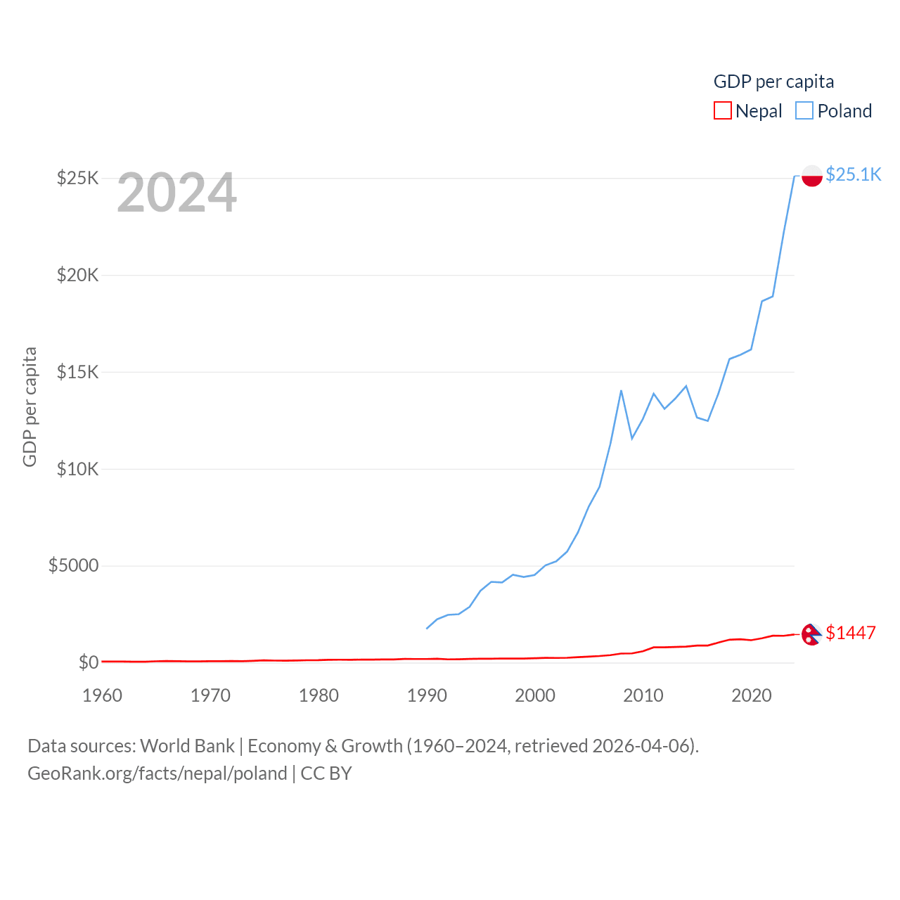 By GDP, Nepal ranks 101/197 ($42.9B) and Poland ranks 21/197 ($918B). By GDP per capita, Nepal ranks 164/197 ($1,447), while Poland ranks 48/197 ($25,104).
