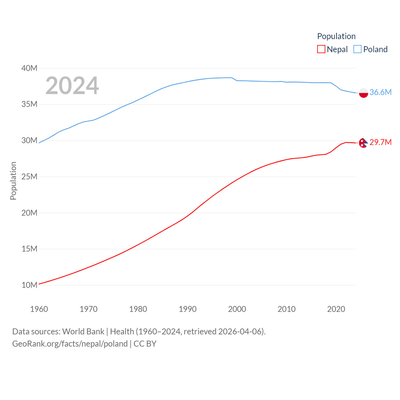 Nepal has a population of 29.7M (ranked 51/197), compared with 36.6M in Poland (ranked 42/197). Nepal's land area is 55,348 sq mi versus 118,252 sq mi for Poland (ranked 92nd vs. 69th).