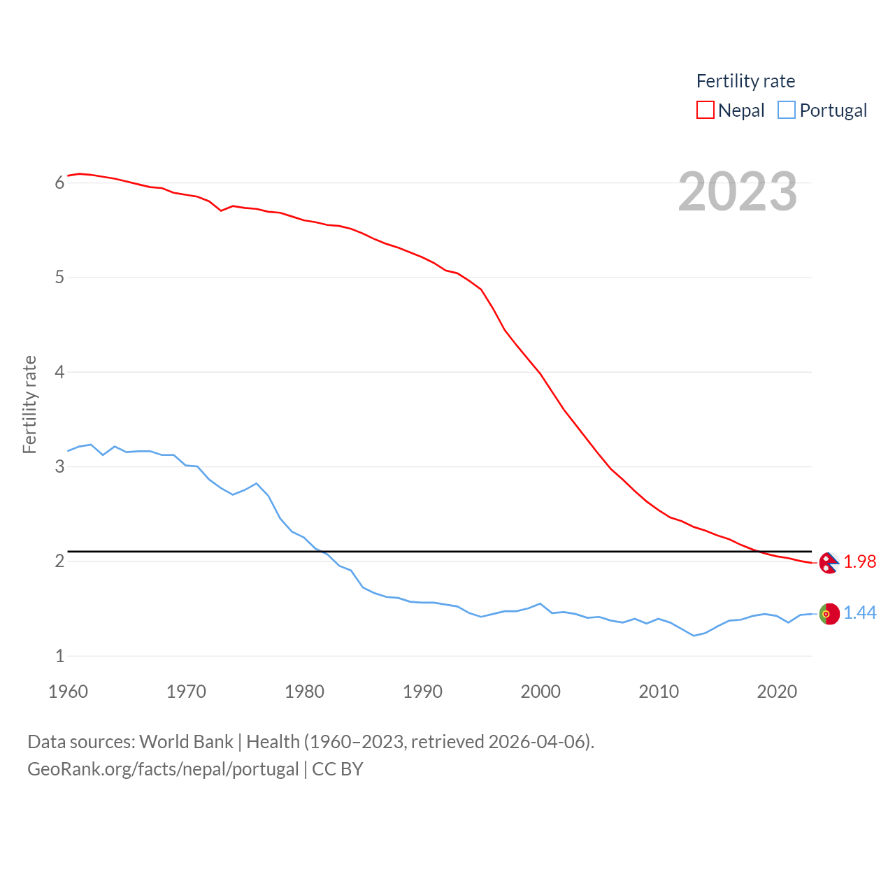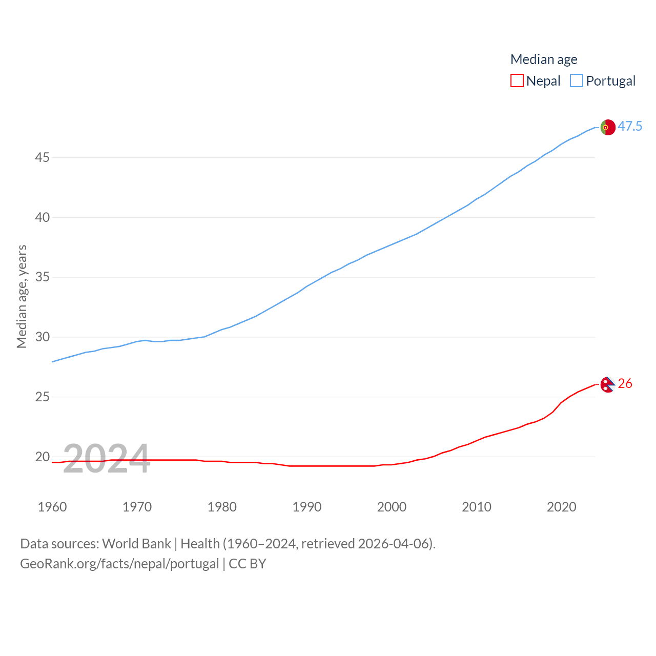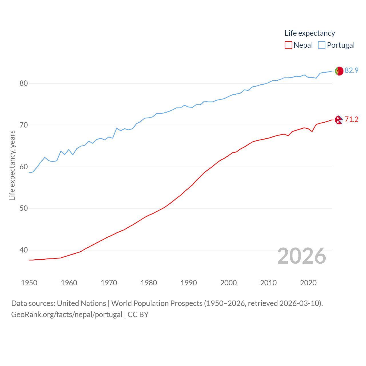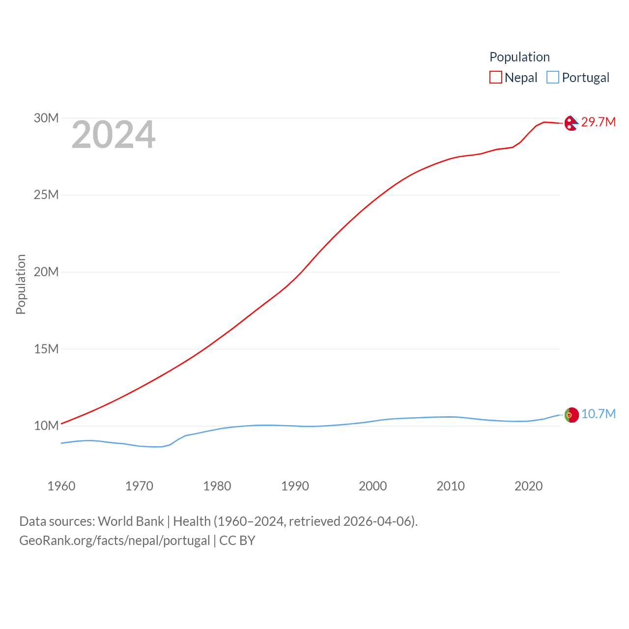 Nepal has a population of 29.7M (ranked 51/197), compared with 10.7M in Portugal (ranked 90/197). Nepal's land area is 55,348 sq mi versus 35,369 sq mi for Portugal (ranked 92nd vs. 108th).