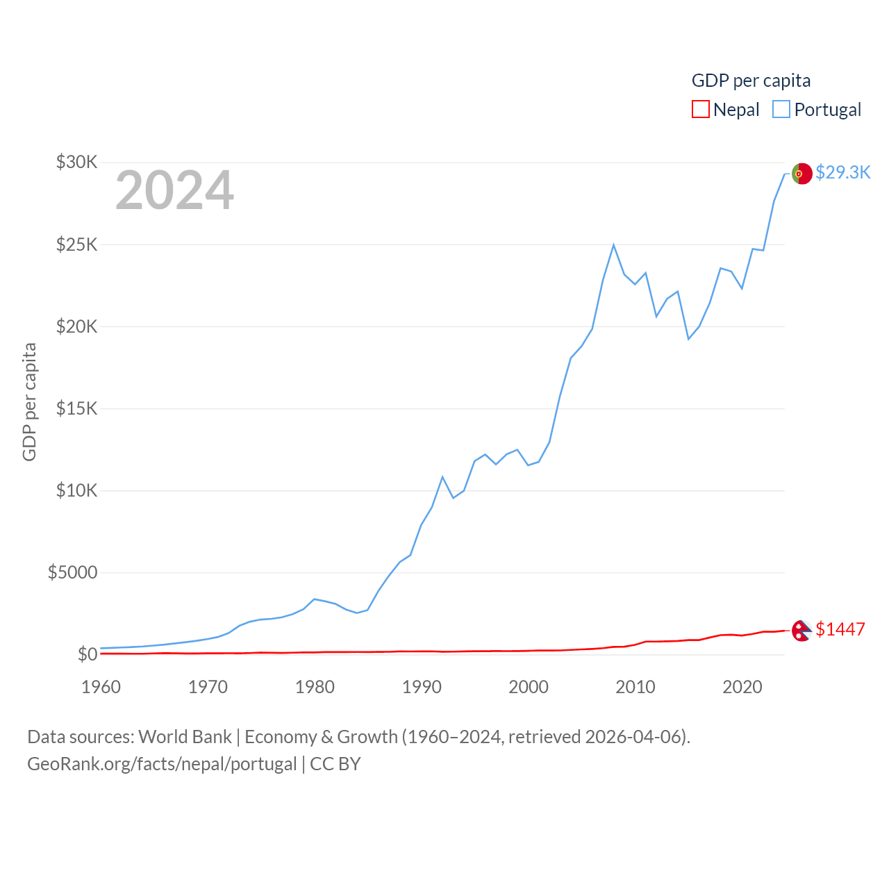 By GDP, Nepal ranks 101/197 ($42.9B) and Portugal ranks 46/197 ($313B). By GDP per capita, Nepal ranks 164/197 ($1,447), while Portugal ranks 44/197 ($29,292).