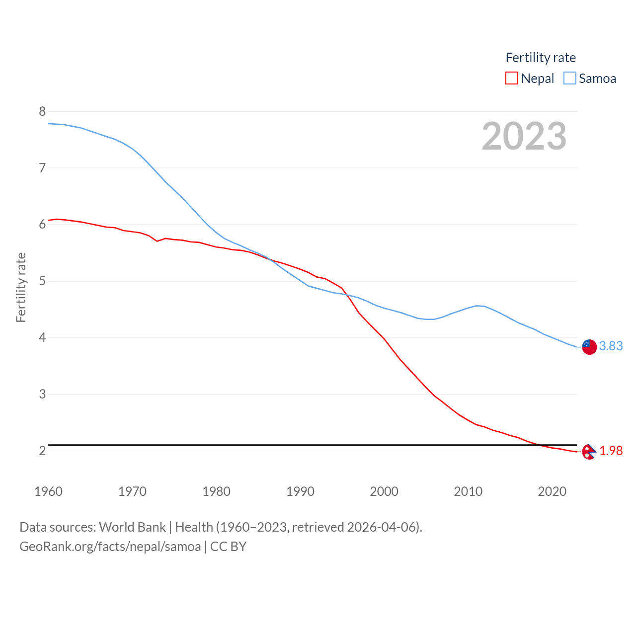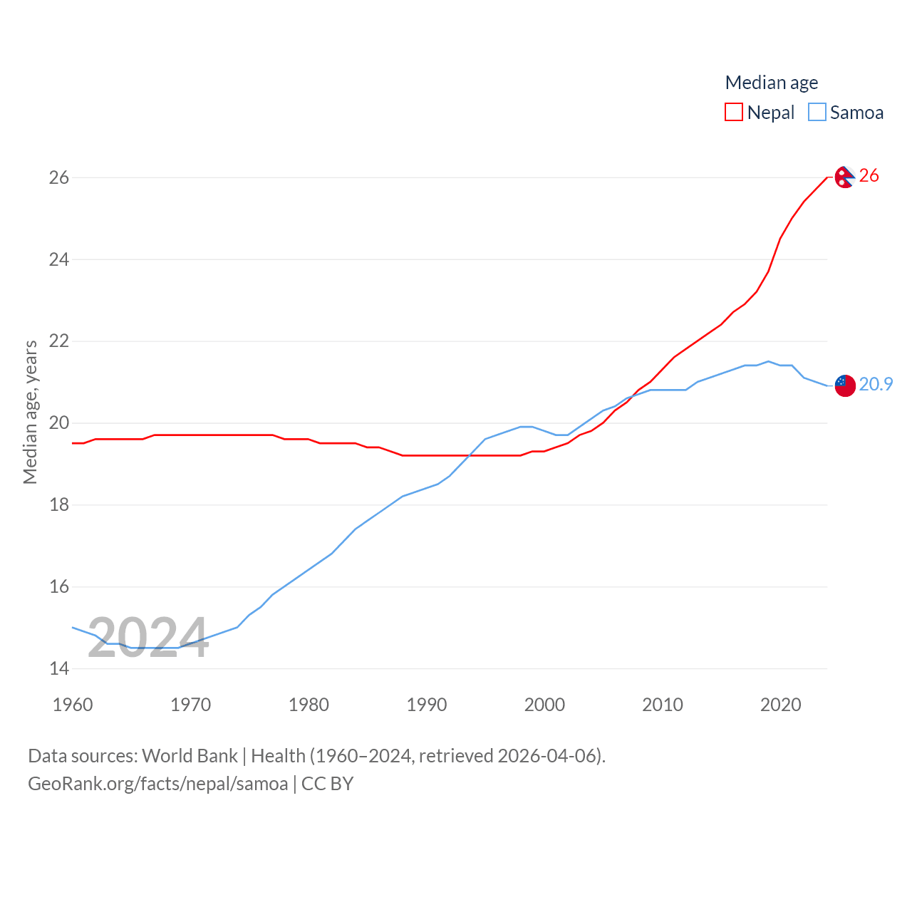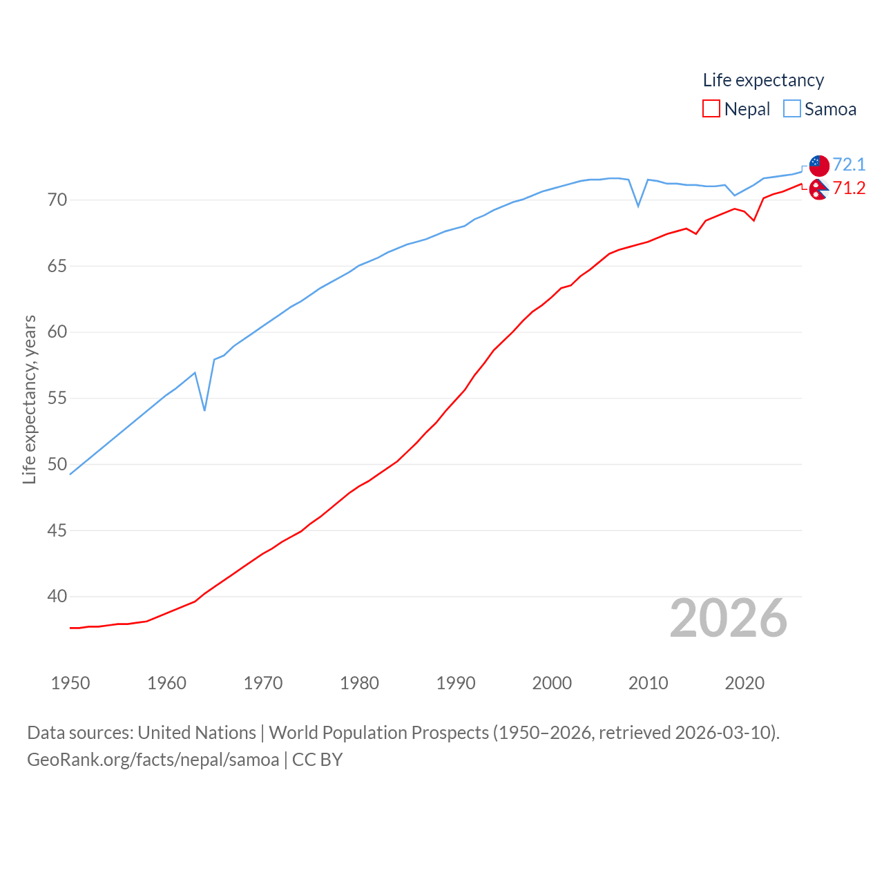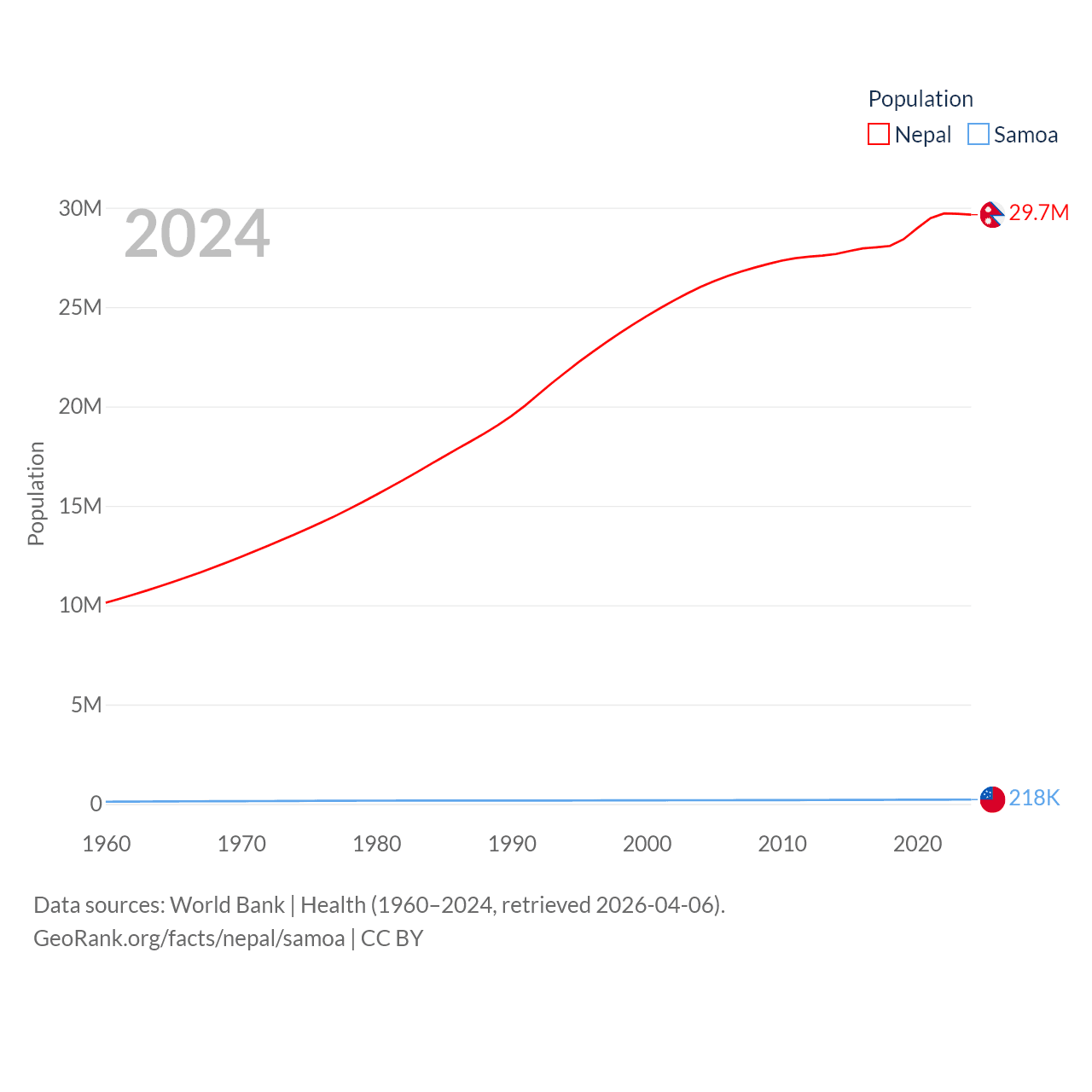 Nepal has a population of 29.7M (ranked 51/197), compared with 218K in Samoa (ranked 177/197). Nepal's land area is 55,348 sq mi versus 1,073 sq mi for Samoa (ranked 92nd vs. 168th).