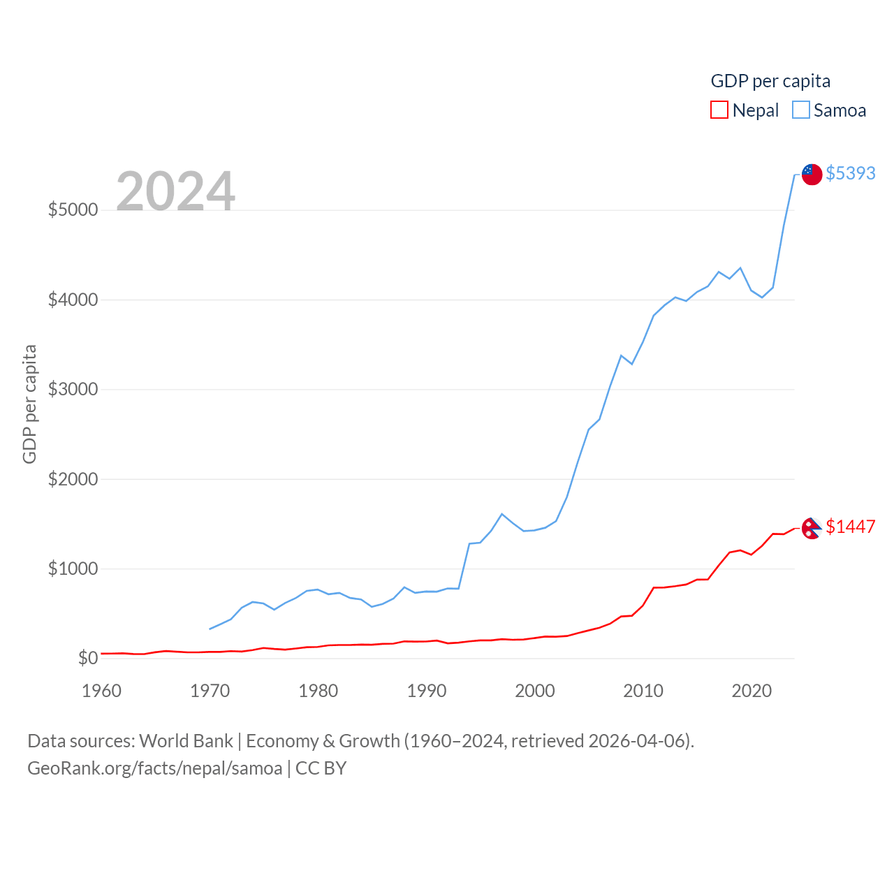 By GDP, Nepal ranks 101/197 ($42.9B) and Samoa ranks 185/197 ($1.18B). By GDP per capita, Nepal ranks 164/197 ($1,447), while Samoa ranks 117/197 ($5,393).
