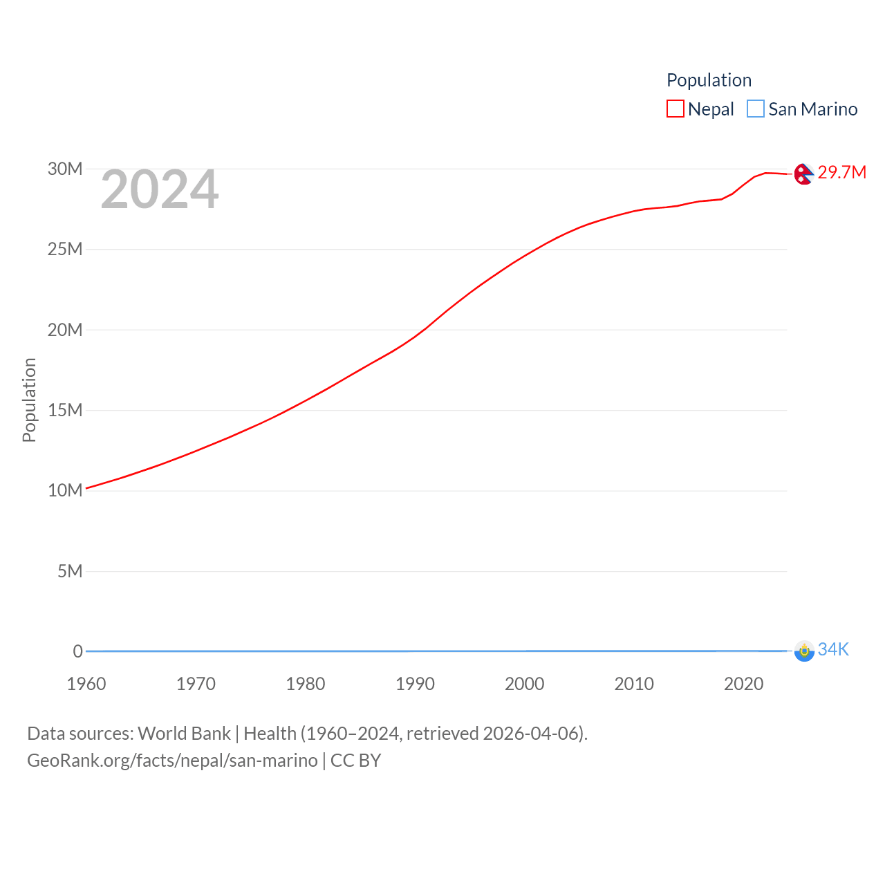 Nepal has a population of 29.7M (ranked 51/197), compared with 34K in San Marino (ranked 193/197). Nepal's land area is 55,348 sq mi versus 23.2 sq mi for San Marino (ranked 92nd vs. 193rd).