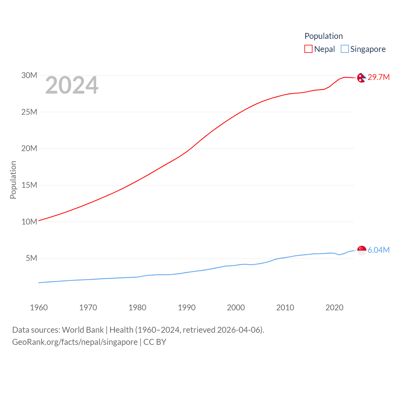 Nepal has a population of 29.7M (ranked 51/197), compared with 6.04M in Singapore (ranked 113/197). Nepal's land area is 55,348 sq mi versus 277.2 sq mi for Singapore (ranked 92nd vs. 177th).