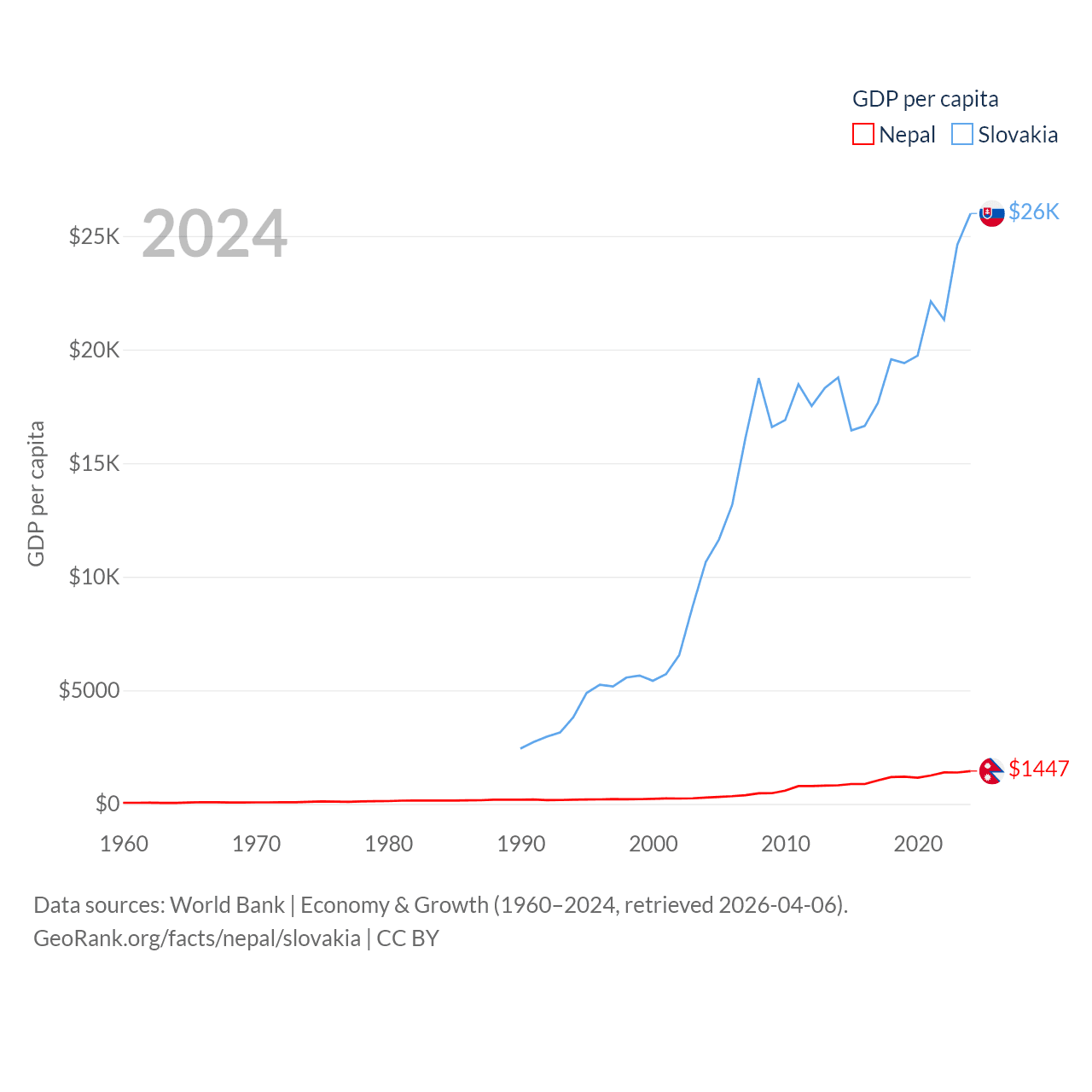 By GDP, Nepal ranks 101/197 ($42.9B) and Slovakia ranks 61/197 ($141B). By GDP per capita, Nepal ranks 164/197 ($1,447), while Slovakia ranks 47/197 ($25,993).
