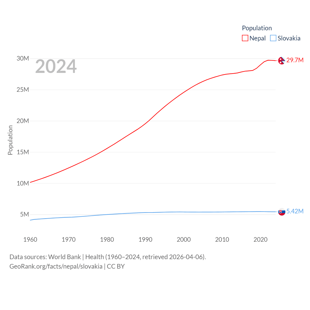 Nepal has a population of 29.7M (ranked 51/197), compared with 5.42M in Slovakia (ranked 119/197). Nepal's land area is 55,348 sq mi versus 18,564 sq mi for Slovakia (ranked 92nd vs. 128th).