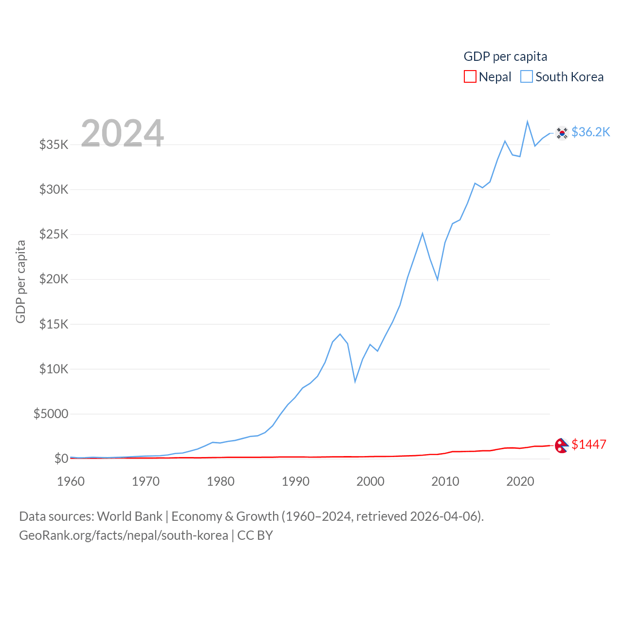 By GDP, Nepal ranks 101/197 ($42.9B) and South Korea ranks 12/197 ($1.88T). By GDP per capita, Nepal ranks 164/197 ($1,447), while South Korea ranks 31/197 ($36,239).