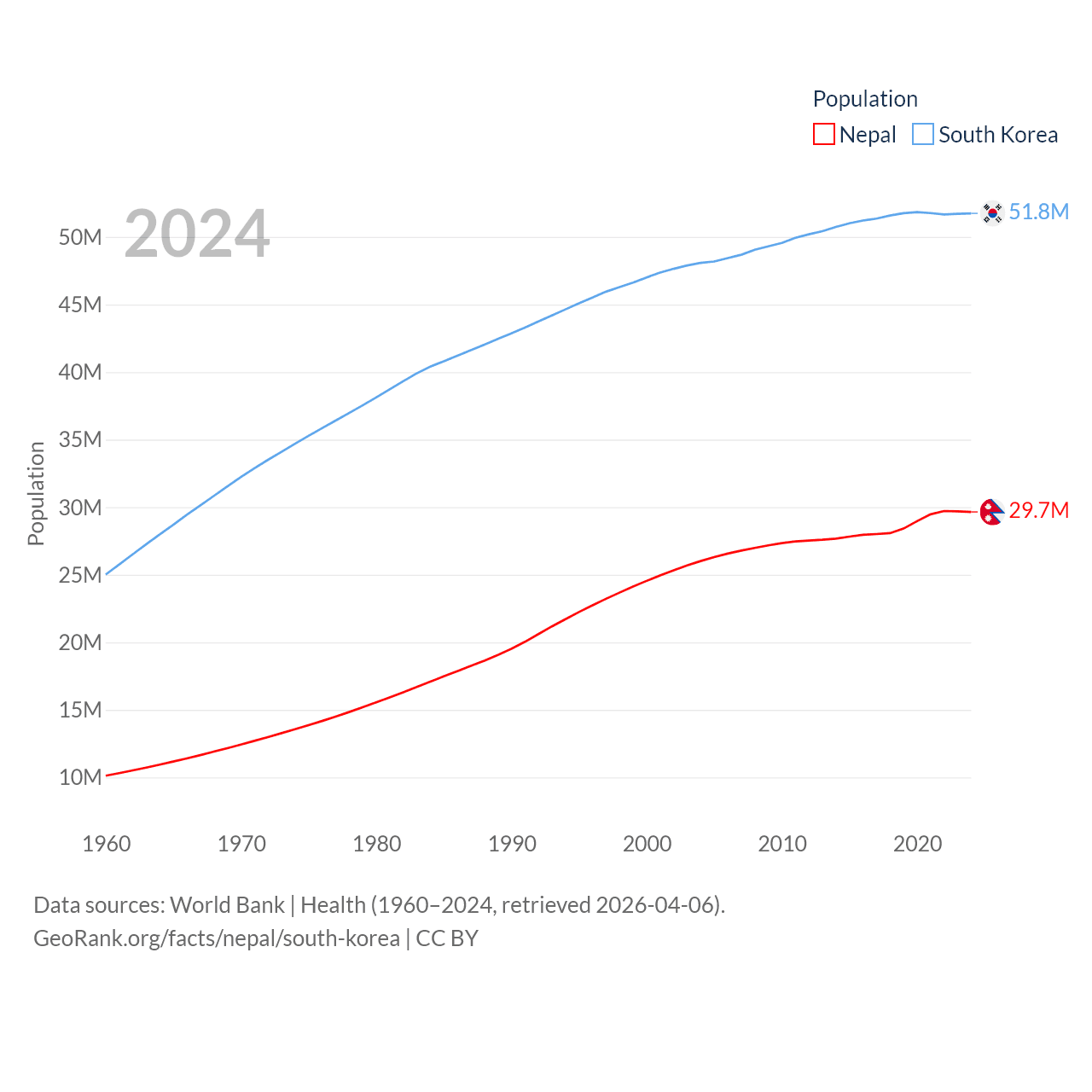 Nepal has a population of 29.7M (ranked 51/197), compared with 51.8M in South Korea (ranked 29/197). Nepal's land area is 55,348 sq mi versus 37,684 sq mi for South Korea (ranked 92nd vs. 105th).