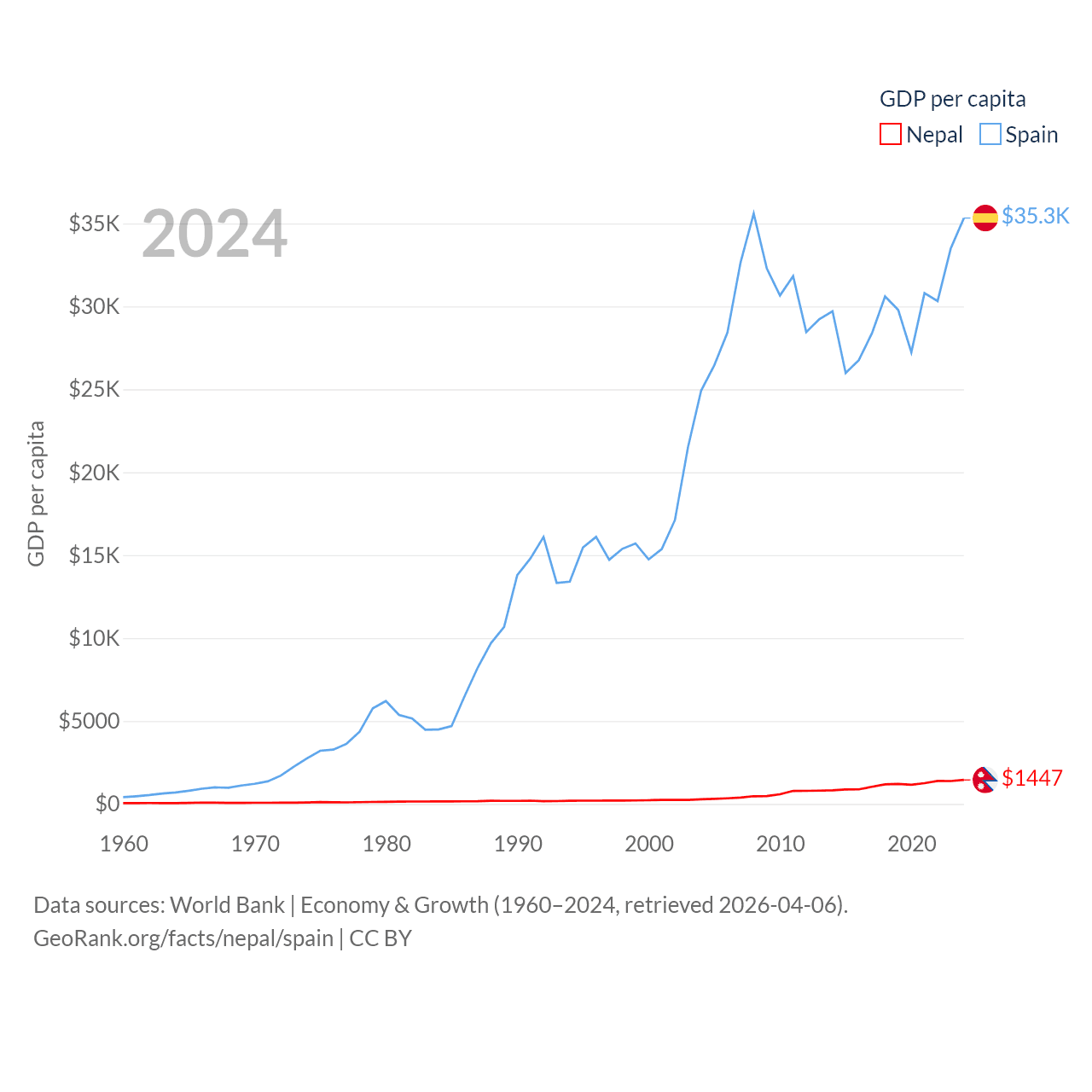 By GDP, Nepal ranks 101/197 ($42.9B) and Spain ranks 15/197 ($1.73T). By GDP per capita, Nepal ranks 164/197 ($1,447), while Spain ranks 32/197 ($35,327).