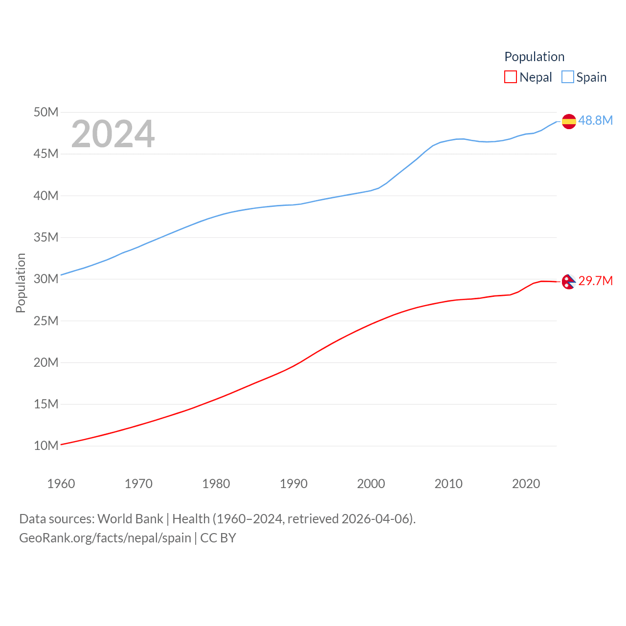 Nepal has a population of 29.7M (ranked 51/197), compared with 48.8M in Spain (ranked 32/197). Nepal's land area is 55,348 sq mi versus 192,934 sq mi for Spain (ranked 92nd vs. 51st).