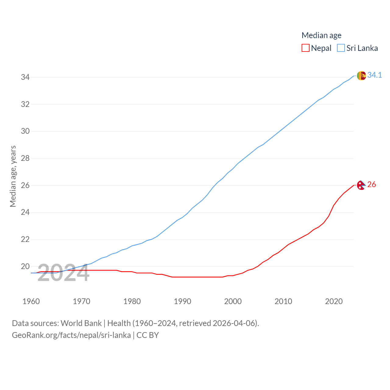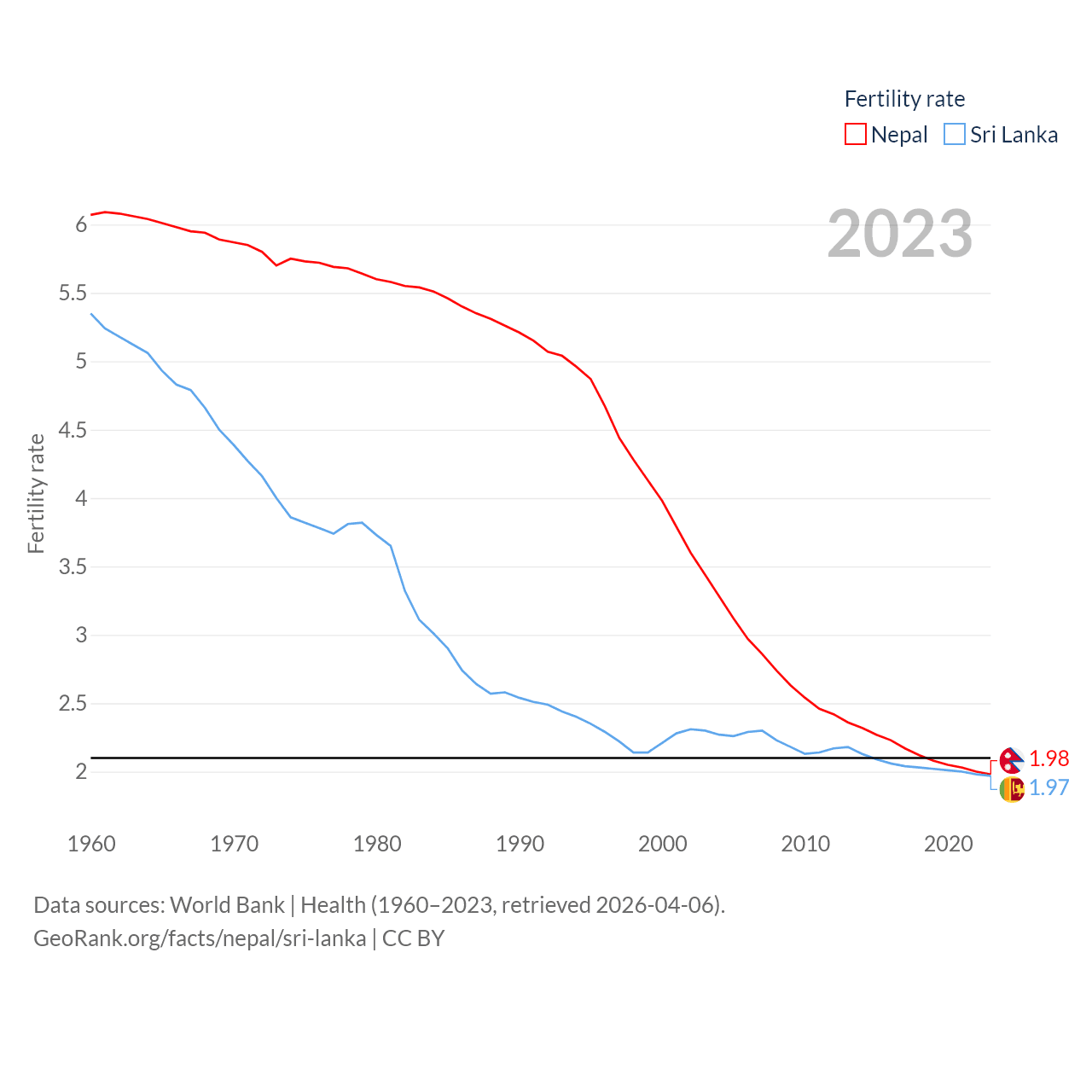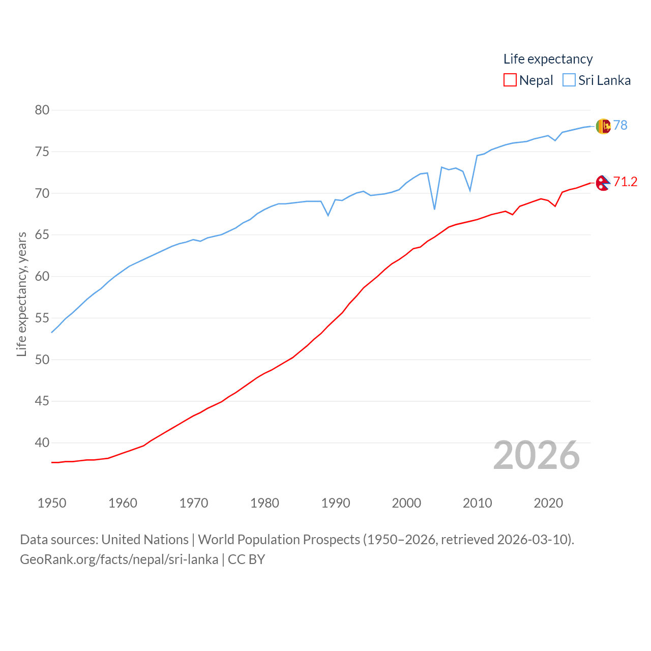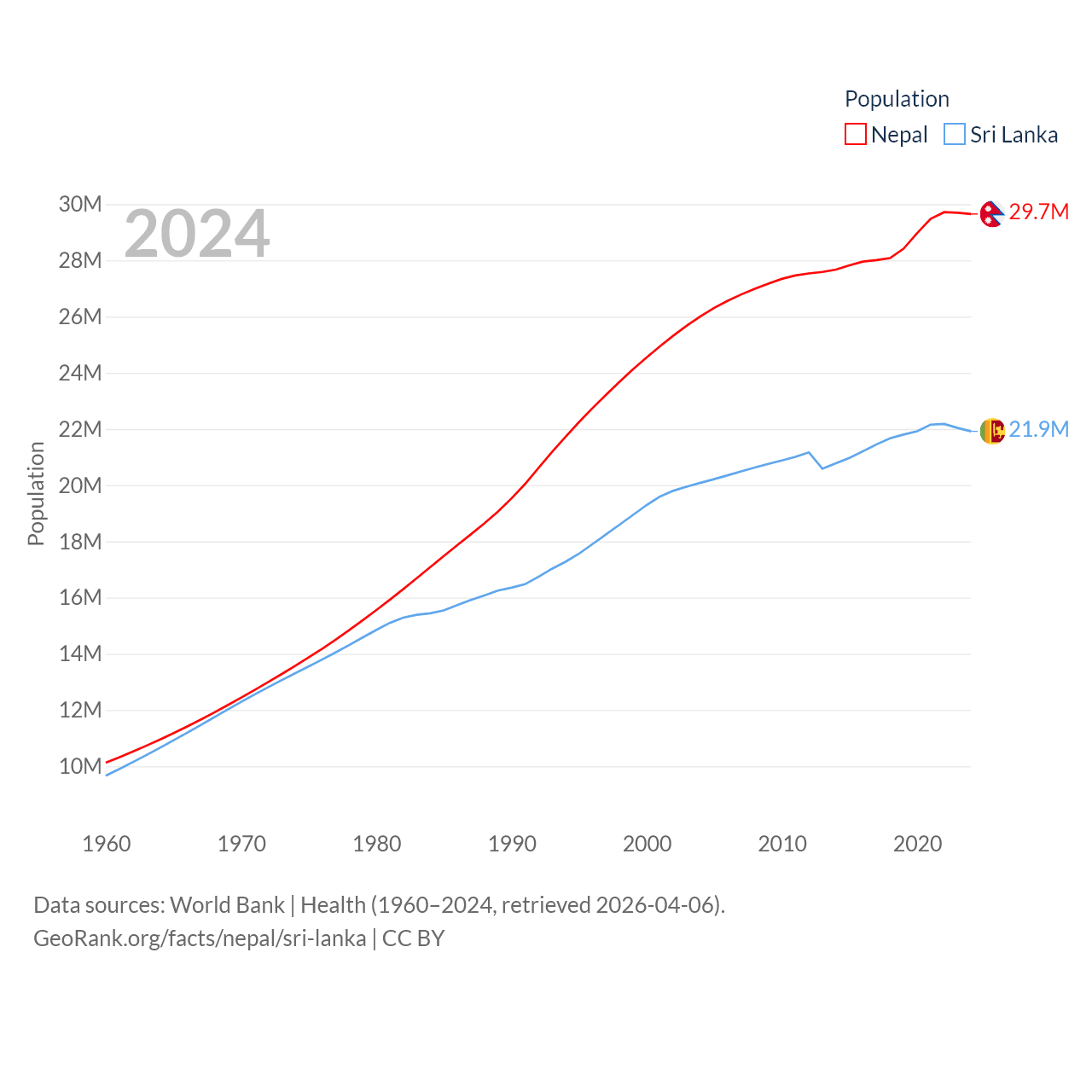 Nepal has a population of 29.7M (ranked 51/197), compared with 21.9M in Sri Lanka (ranked 61/197). Nepal's land area is 55,348 sq mi versus 23,884 sq mi for Sri Lanka (ranked 92nd vs. 122nd).