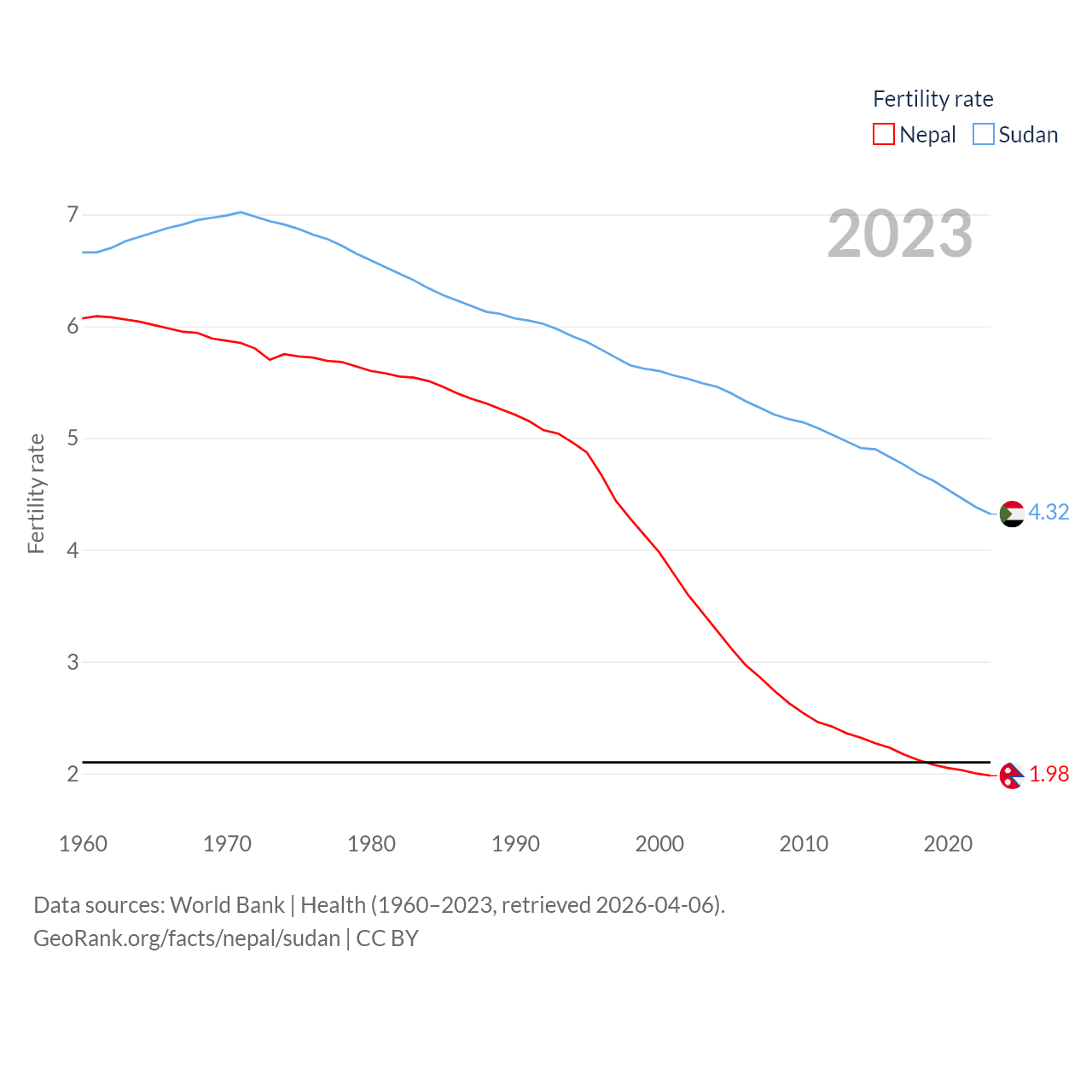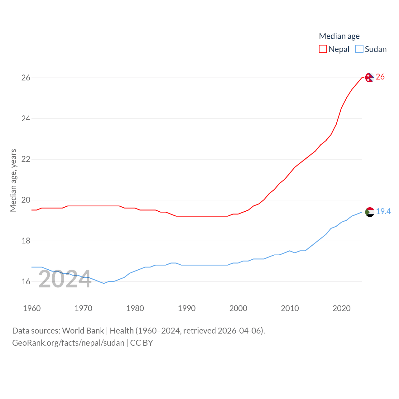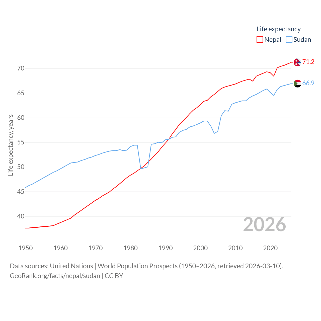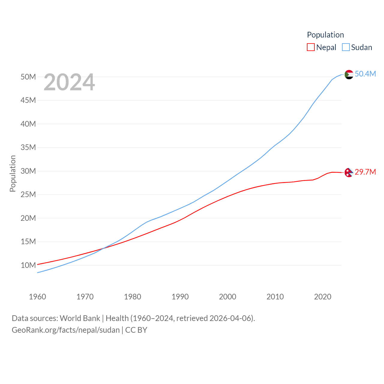 Nepal has a population of 29.7M (ranked 51/197), compared with 50.4M in Sudan (ranked 30/197). Nepal's land area is 55,348 sq mi versus 721,239 sq mi for Sudan (ranked 92nd vs. 15th).
