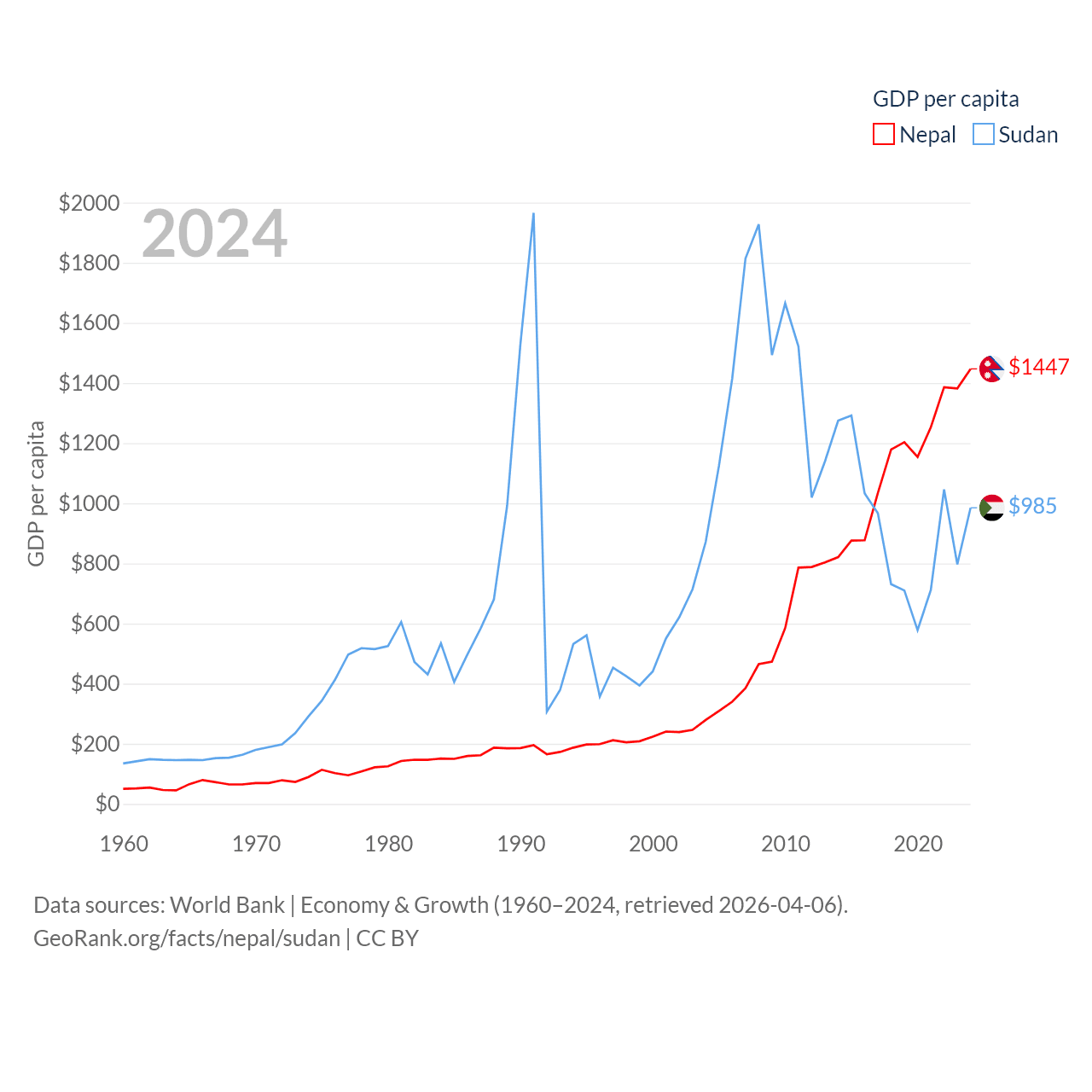 By GDP, Nepal ranks 101/197 ($42.9B) and Sudan ranks 94/197 ($49.7B). By GDP per capita, Nepal ranks 164/197 ($1,447), while Sudan ranks 179/197 ($985).