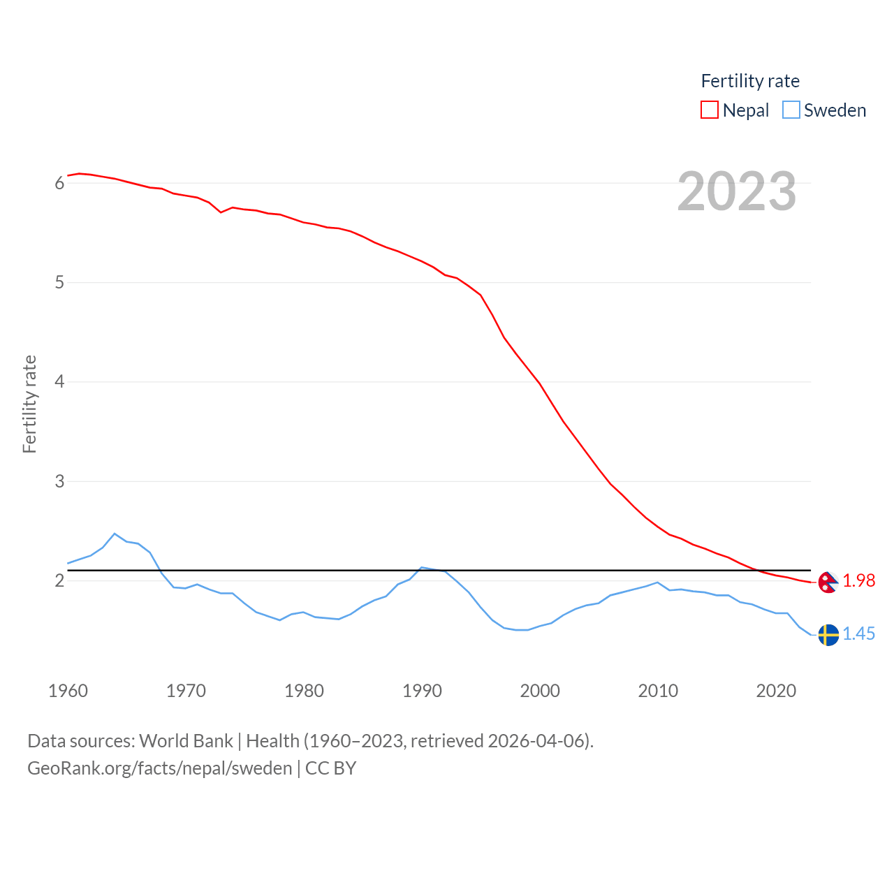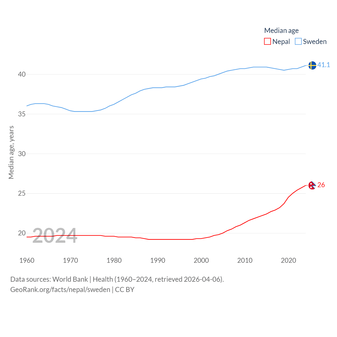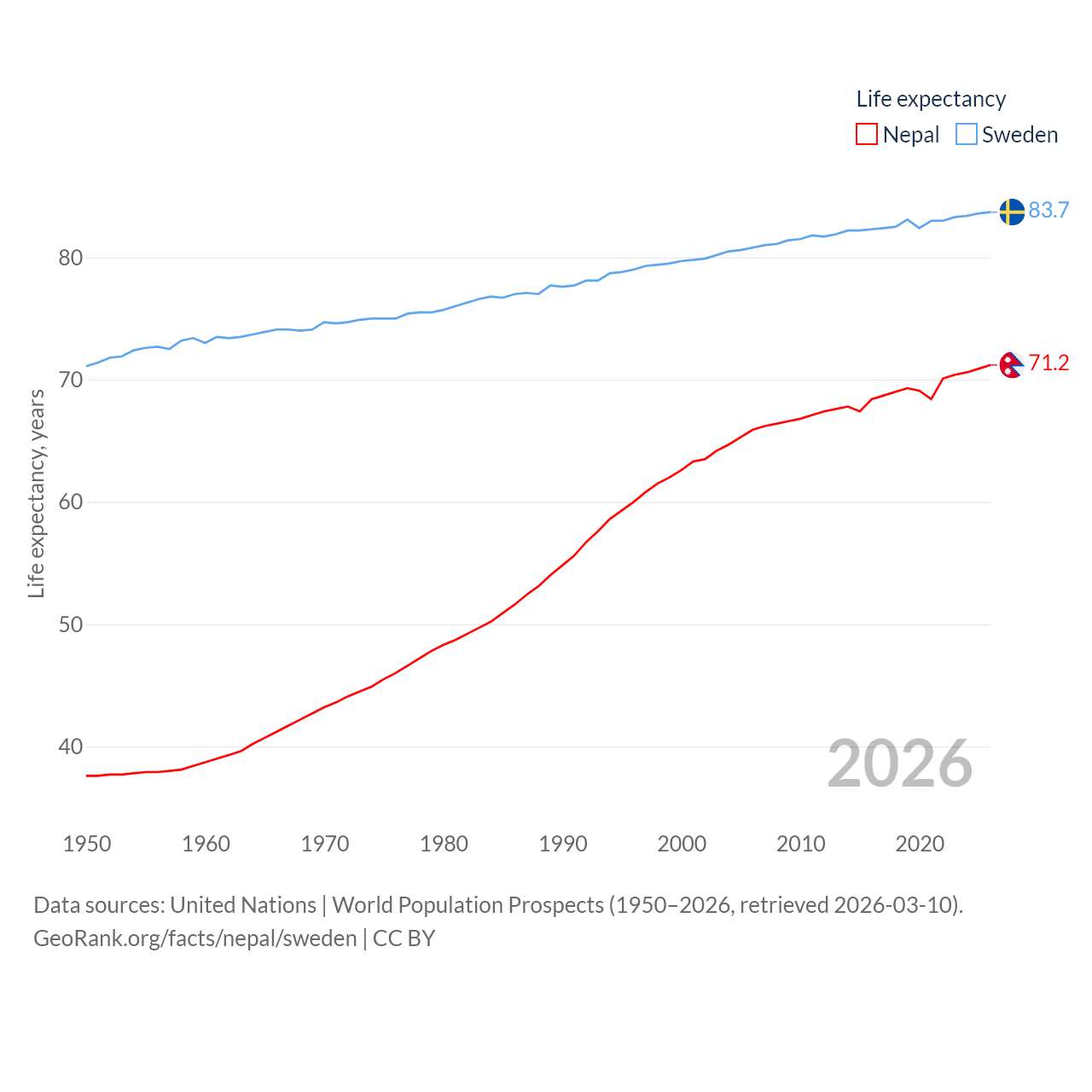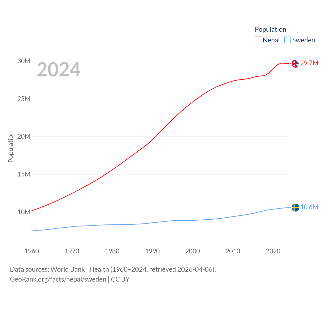 Nepal has a population of 29.7M (ranked 51/197), compared with 10.6M in Sweden (ranked 93/197). Nepal's land area is 55,348 sq mi versus 157,248 sq mi for Sweden (ranked 92nd vs. 58th).