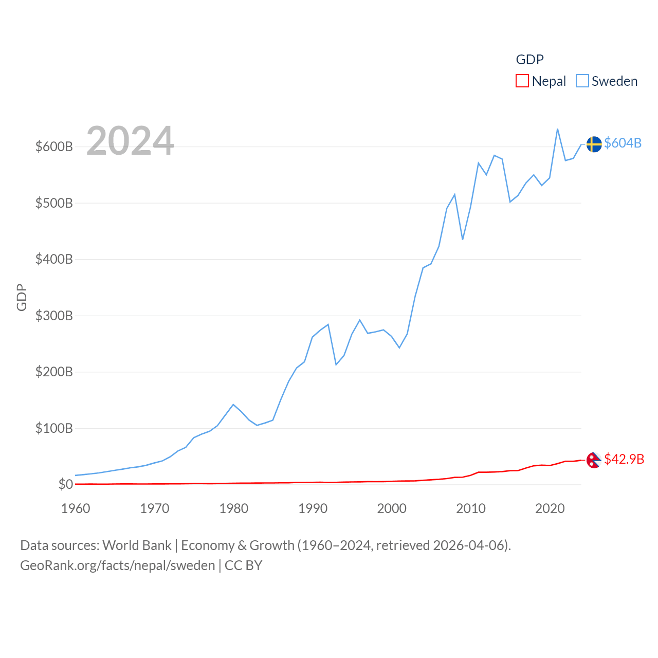 By GDP, Nepal ranks 101/197 ($42.9B) and Sweden ranks 26/197 ($604B). By GDP per capita, Nepal ranks 164/197 ($1,447), while Sweden ranks 17/197 ($57,117).