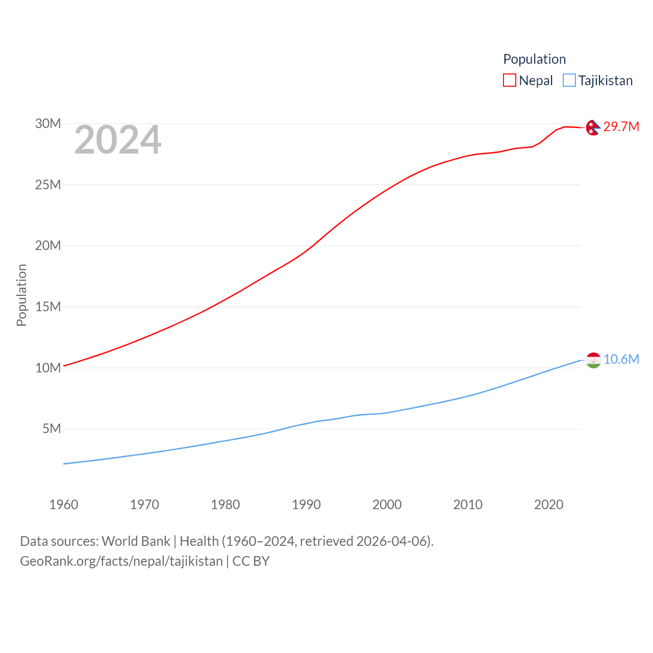 Nepal has a population of 29.7M (ranked 51/197), compared with 10.6M in Tajikistan (ranked 91/197). Nepal's land area is 55,348 sq mi versus 53,587 sq mi for Tajikistan (ranked 92nd vs. 93rd).